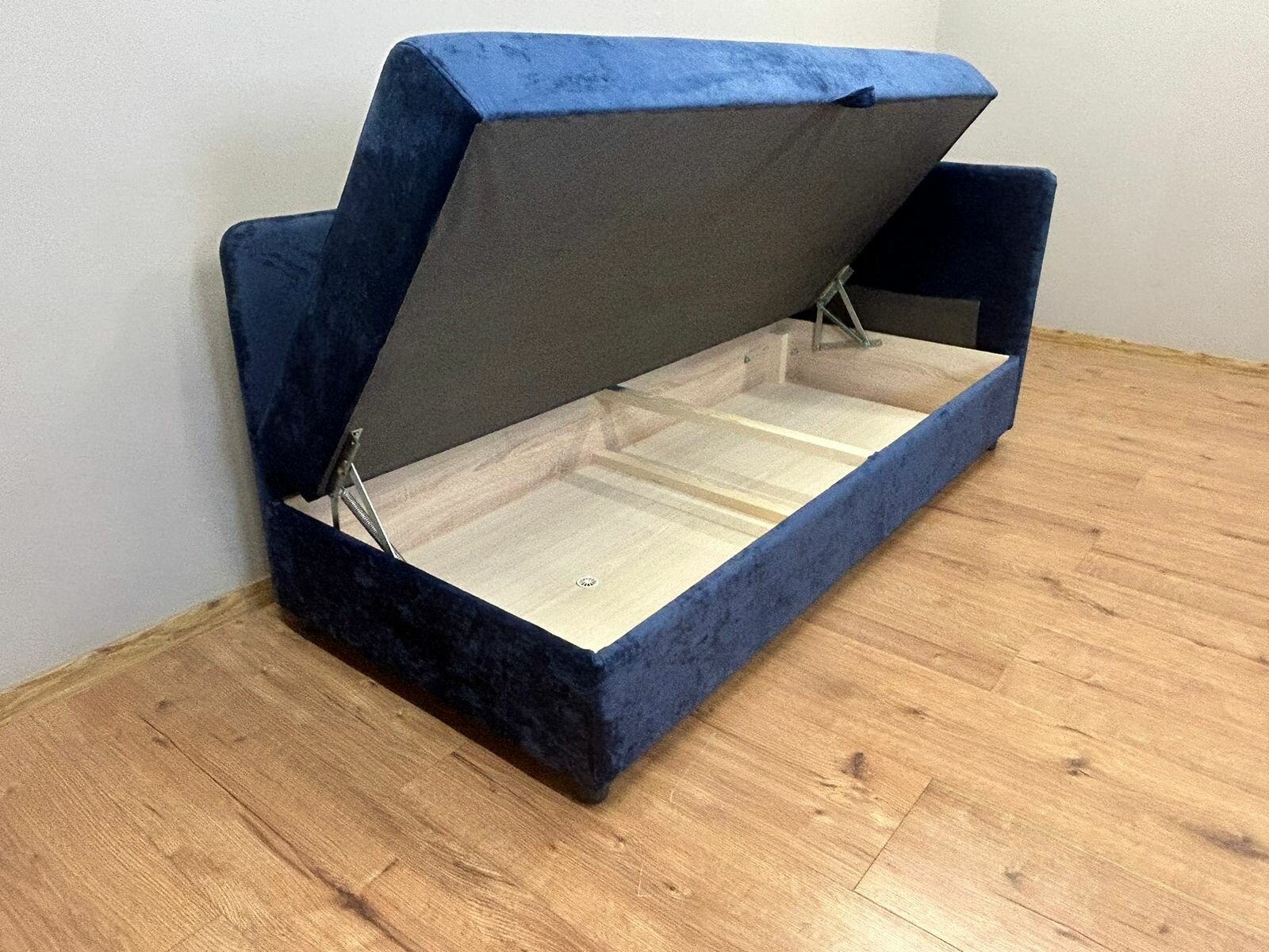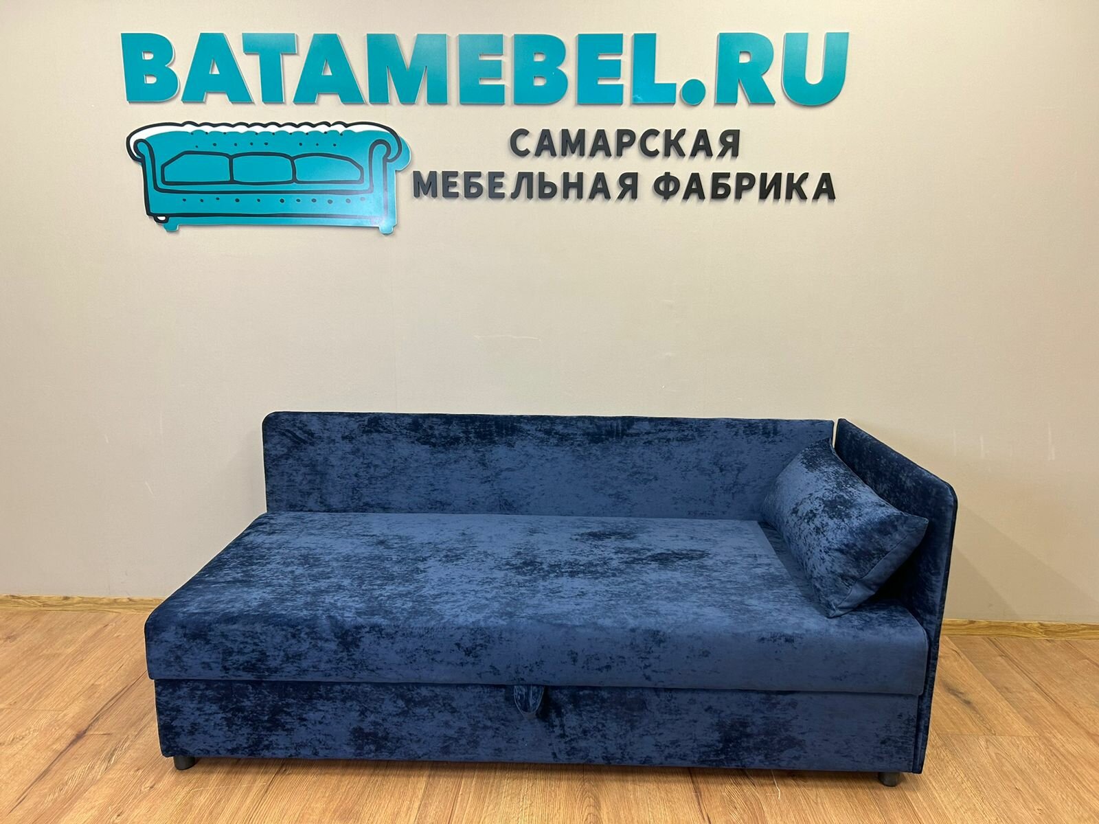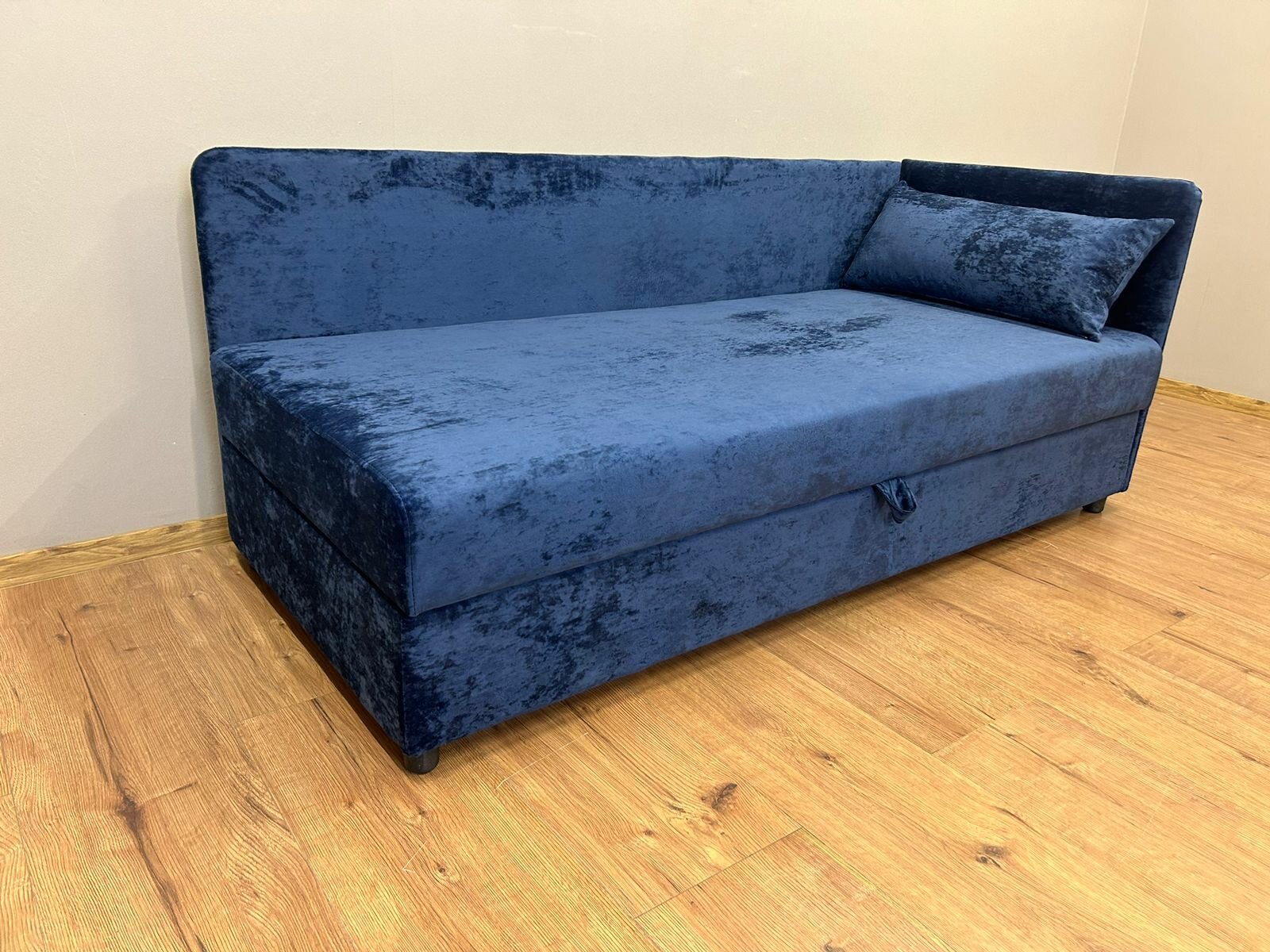 Диван-кровать "Голубая тахта односпальная прямая", 73х82, велюр, ящик для белья, правый угол