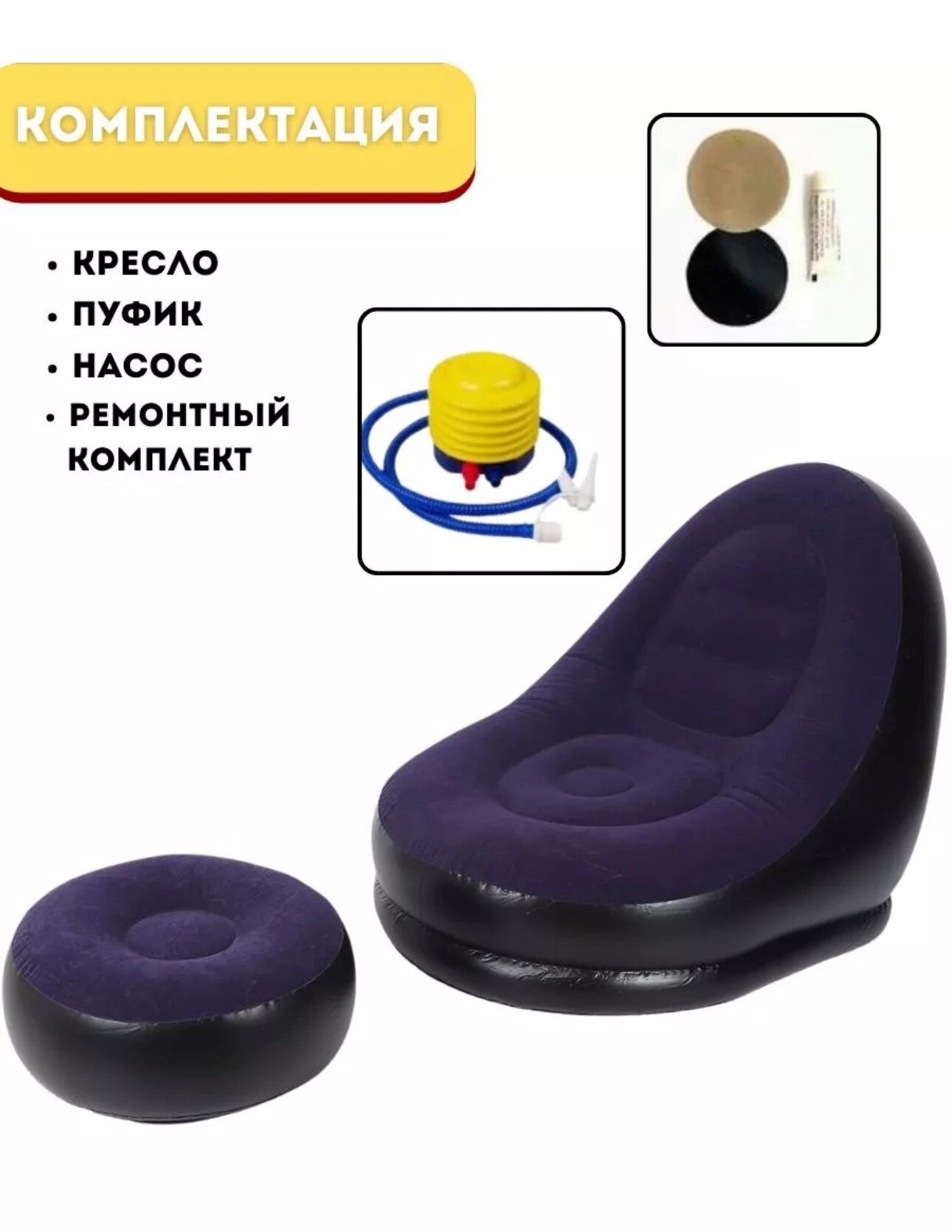 Кресло надувное одноместное с пуфом и насосом, синее интересное: