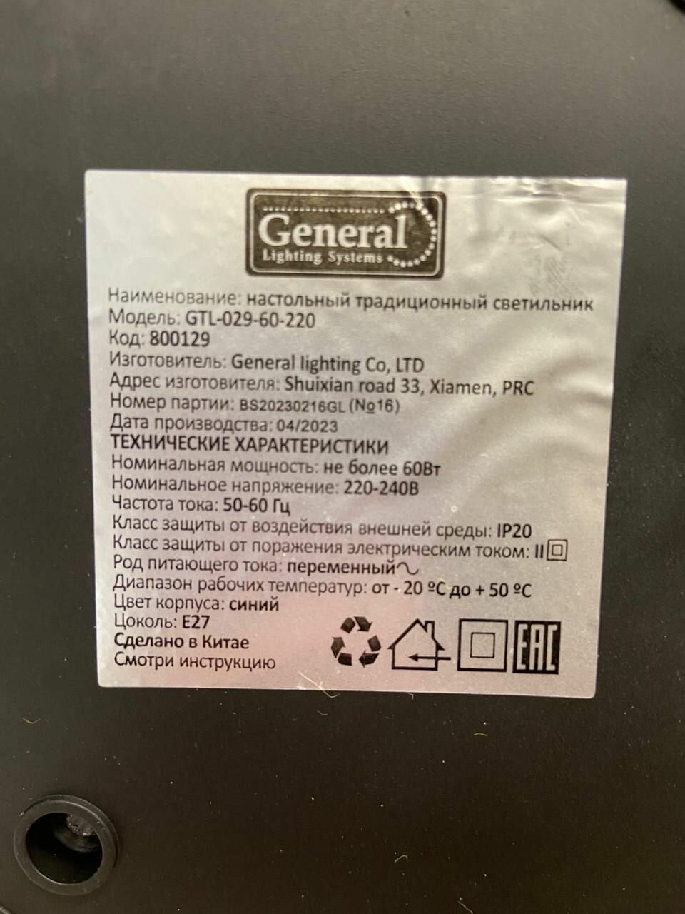 General, Светильник настольный, Цвет товара синий, Крепление Платформа, Тип цоколя E27, От сети 220В, Степень пылевлагозащищенности IP20