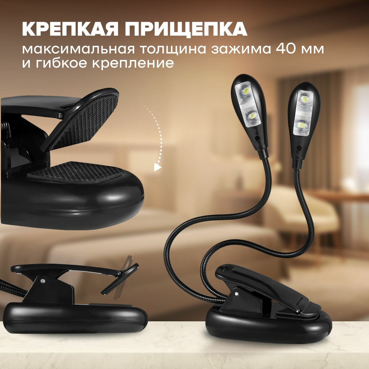 Светильник на прищепке, MELL светодиодный для чтения на батарейках для крепления на книгу интересное: