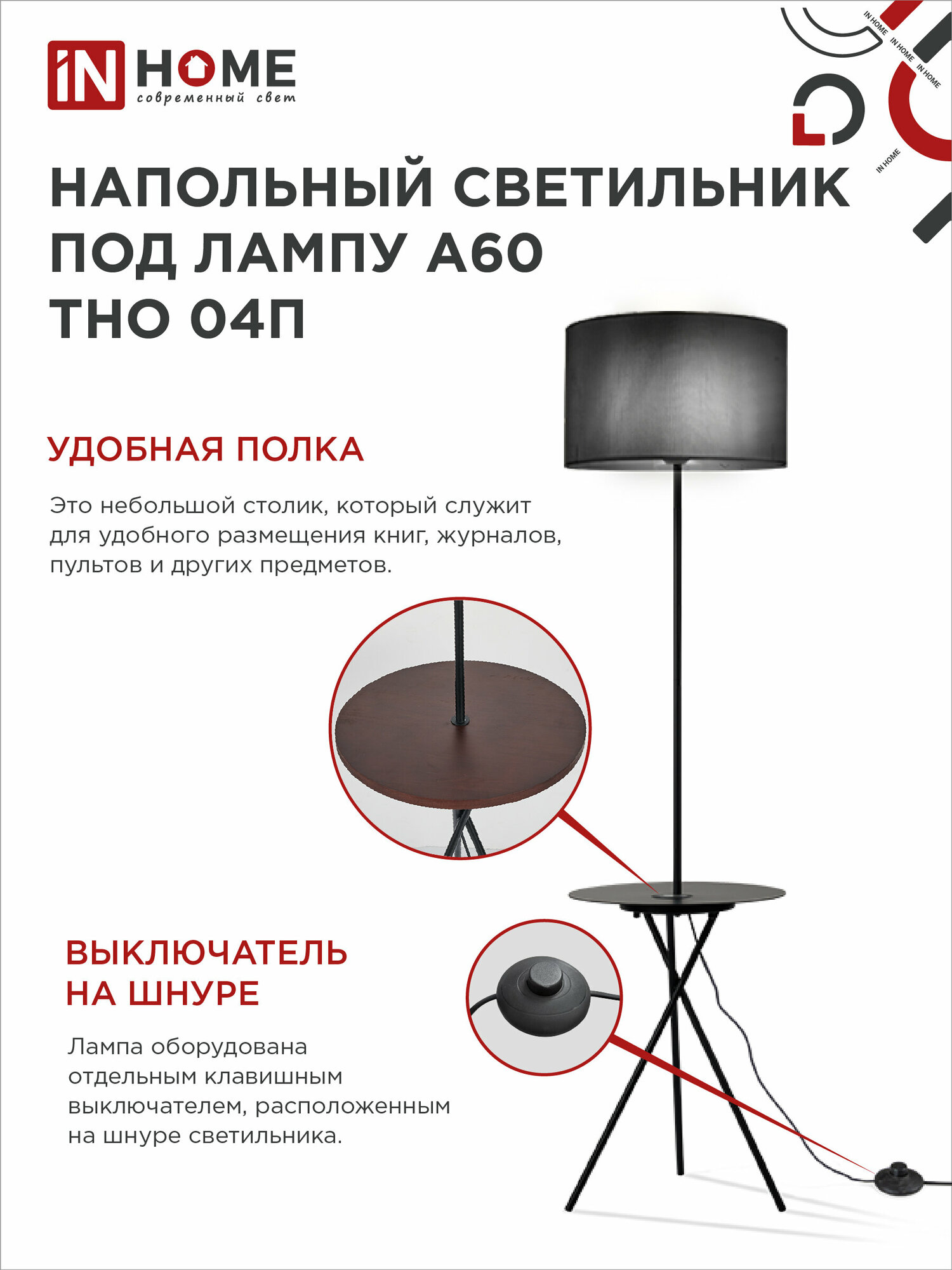 Купить Светильник напольный торшер п/лампу на основании ТНО 04П-ВB 60Вт Е27 230В с полкой черный IN HOME