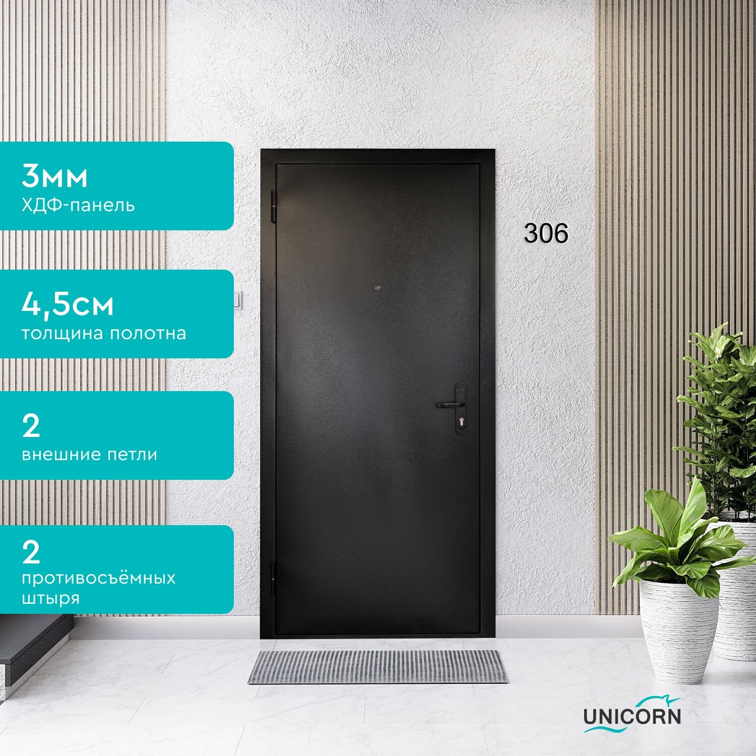 Дверь входная для квартиры Unicorn металлическая Terminal 960х2050, открывание вправо, антивандальное покрытие, уплотнитель, противосъемные ригели, цилиндровый замок, черный/белый