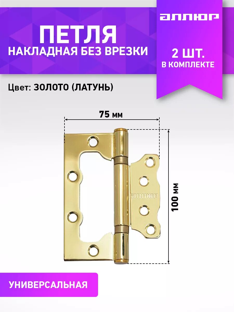 СохранитьПетля накладная универсальная Аллюр 2BB BP, 100 x 75 x 2,5 мм, золото (латунь), 2шт интересное: