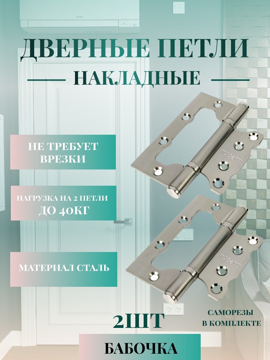 Петля стальная, накладная бабочка,100*75*2,5, 2 подшипника, б/колп, никель матовый (без врезки)