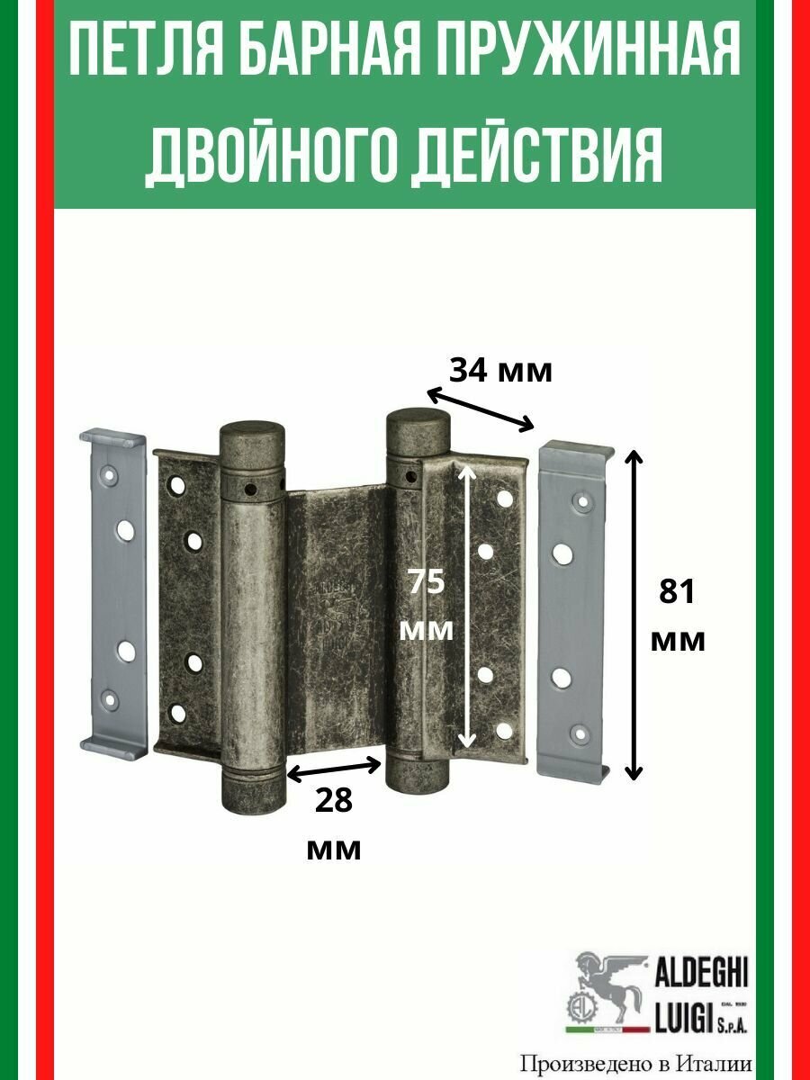 СохранитьБарная пружинная петля двойного действия ALDEGHI LUIGI SpA 75х34х28 мм, античное серебро, к-т: 2 шт + ключ с декоративными шурупами, 101FA075B2 интересное: