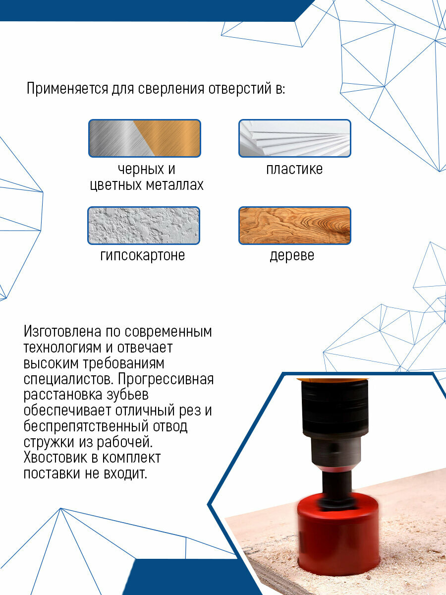 | Дополнительная информация | В комплект входит центрирующее сверло, которое исключает возможность смещения инструмента во время работы. |