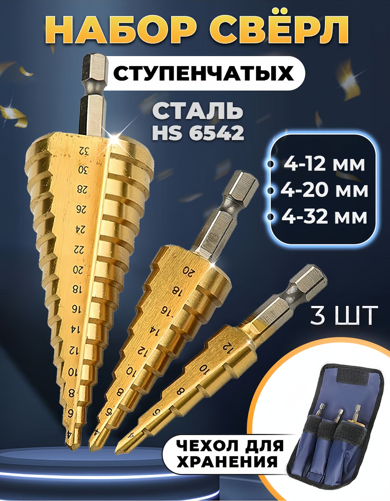 Набор ступенчатых сверл по металлу 4-12, 4-20, 4-32 в чехле