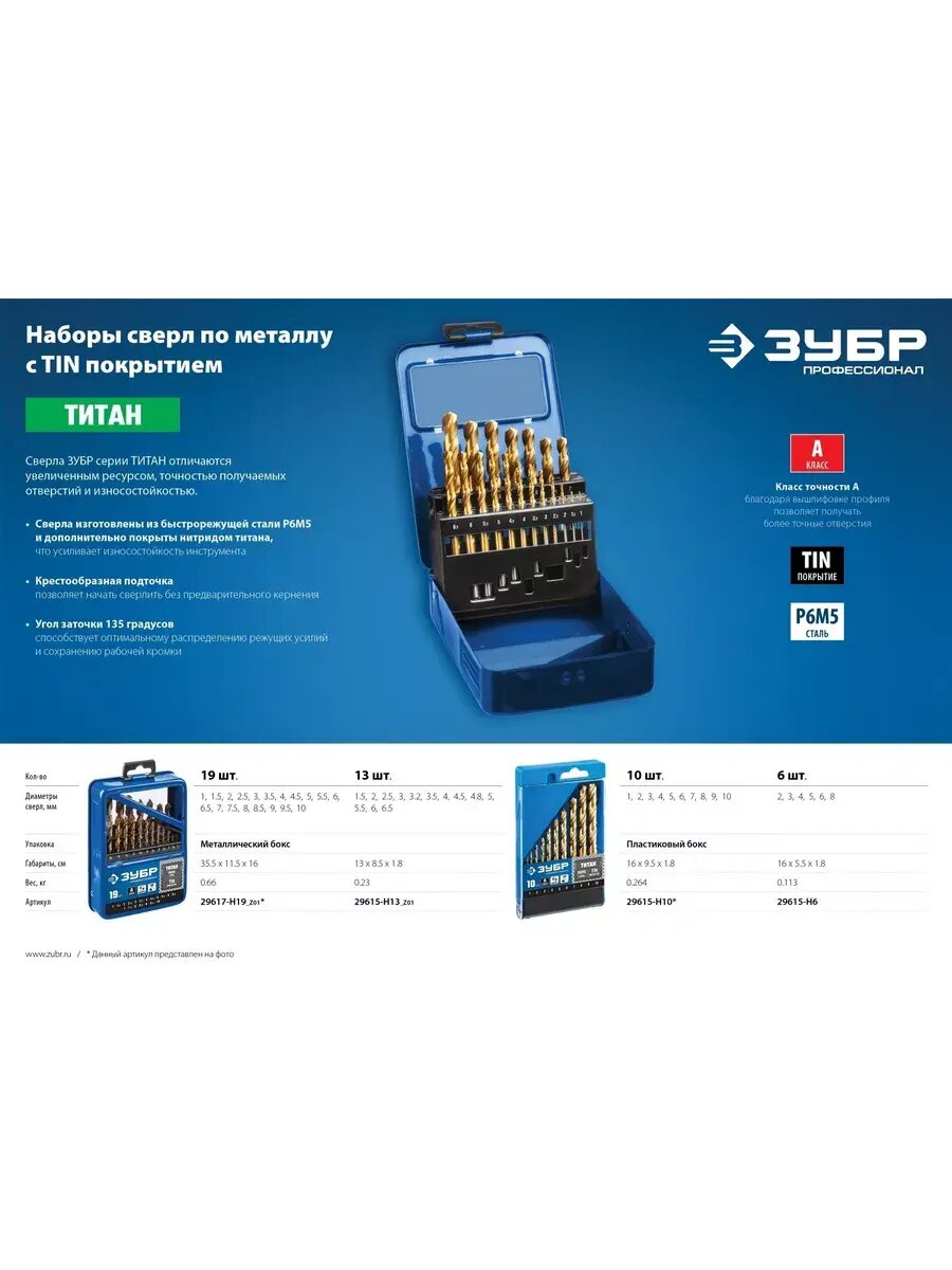 Купить Набор ЗУБР Свёрла по метал с покр. нитрид титана, в пласт боксе, HSS 1-10мм, 19 шт 29617-Н19
