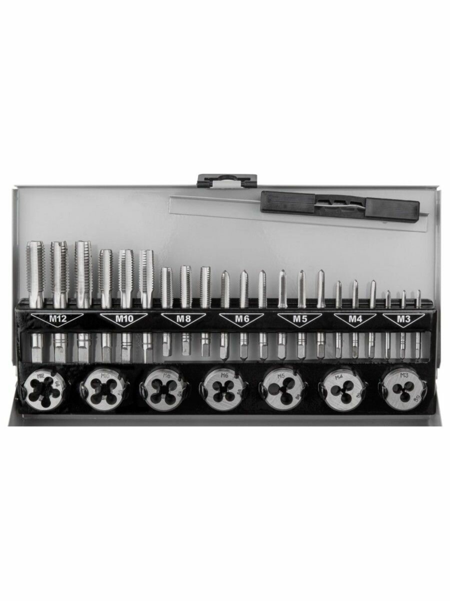 | Подробная комплектация | метчикодержатель: 1 шт; плашкодержатель: 1шт; резьбомер: 1 шт; отвертка: 1шт; плашки: M3х0.5, M4х0.7, M5х0.8, M6х1.0, M8х1.25, M10х1.5, M12х1.75; метчики: M3х0.5, M4х0.7, M5х0.8, M6х1.0, M8х1.25, M10х1.5, M12х1.75 |