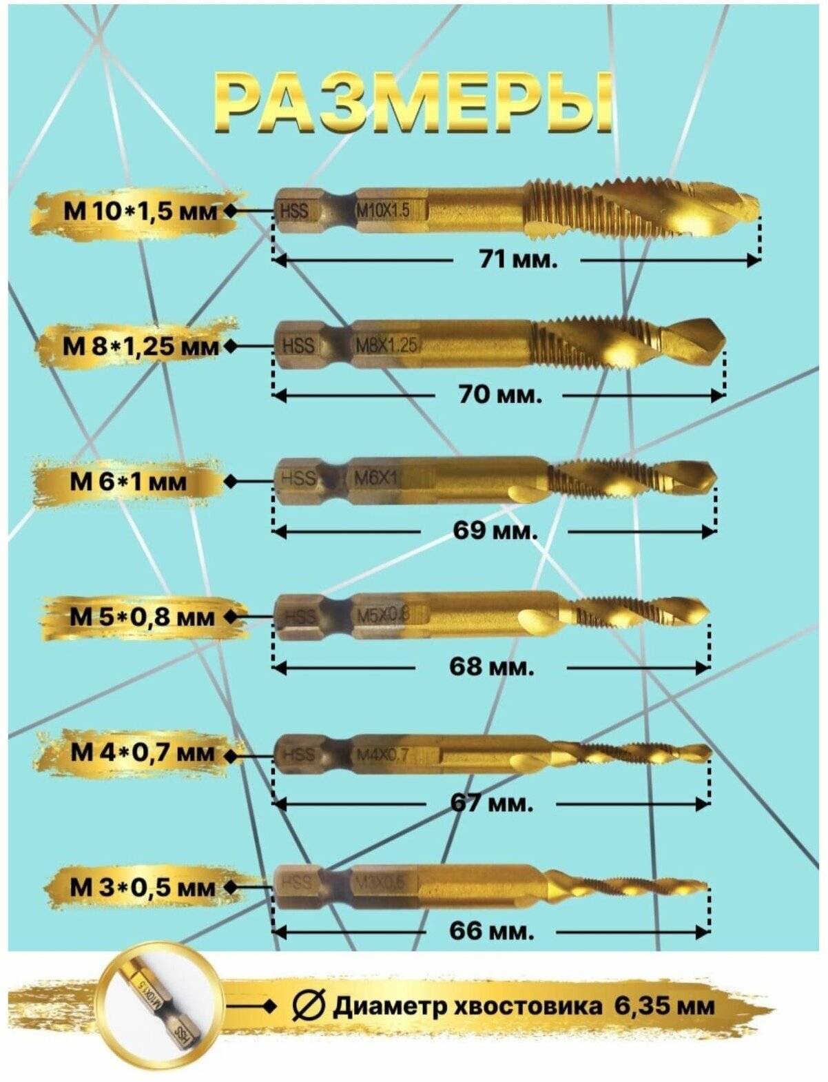 | Размеры сверл | Сверло-метчик с титановым покрытием, набор из 6 штук/ Набор метчиков в боксе / Сверло-метчик с титановым покрытием |