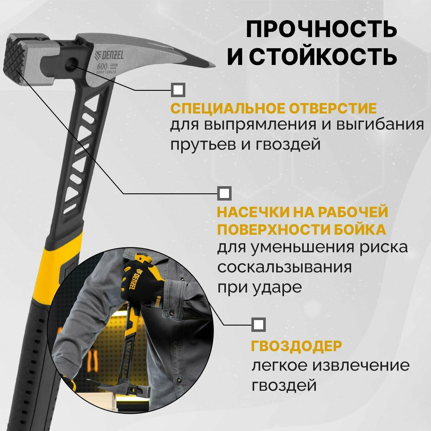 Молоток строительный, гвоздодер Denzel 10468, 450 г, цельнокованый, боек с магнитом, двухкомп. обрезиненная рукоятка