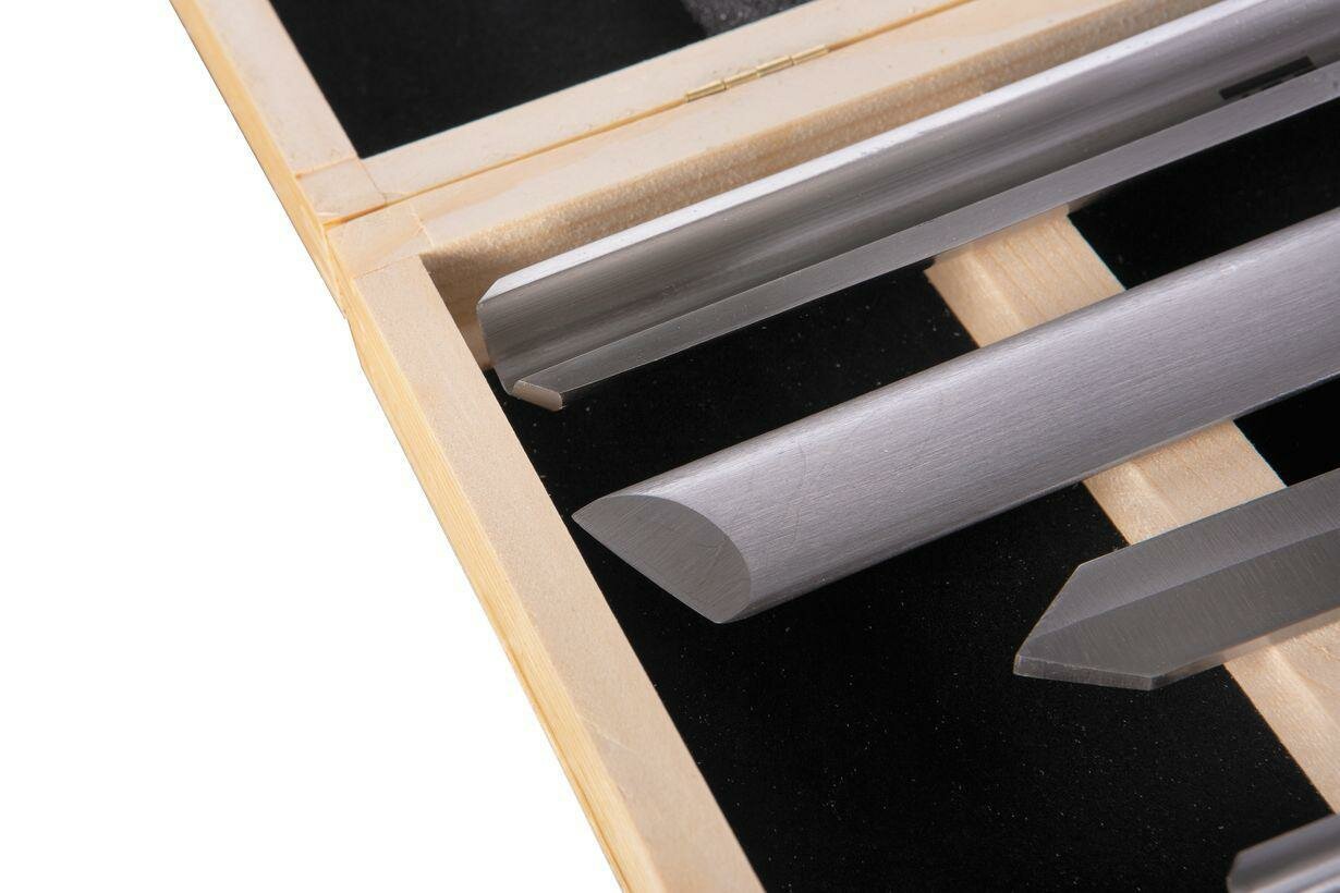 | Состав набора | резец желобчатый HSS, ширина 11 мм, полотно 170 мм, рукоять 255 мм; резец полукруглый (Рейер) HSS, ширина 25 мм, полотно 170 мм, рукоять 300 мм; резец отрезной HSS, форма алмаза, ширина 4,5 мм, полотно 170 мм, рукоять 255 мм; резец косой (Мейсель) HSS, овальный профиль, ширина 30 мм, плотно 170 мм, рукоять 300 мм |