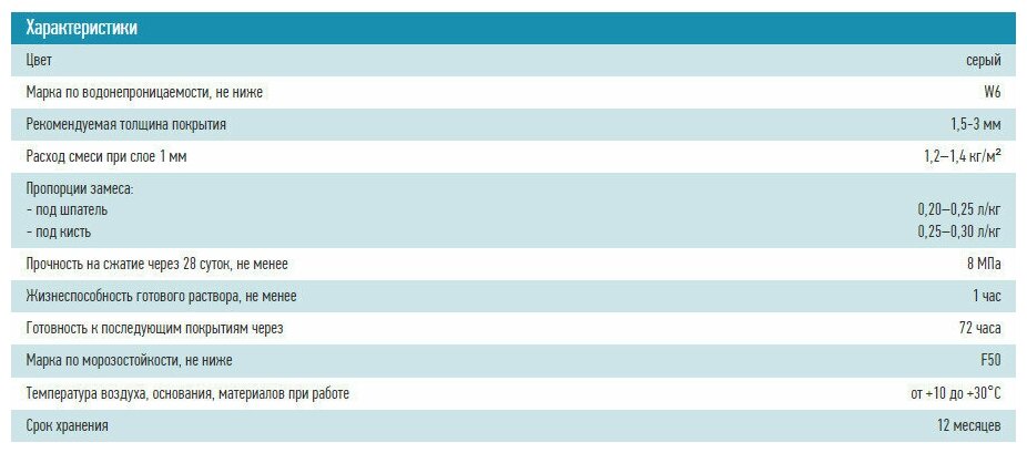 | Дополнительная информация | Рекомендуемая толщина покрытия - 1,5-3 мм. Прочность на сжатие - не менее 8 МПа, Жизнеспособность готового раствора - не менее 1 часа. Следующее покрытие - через 72 часа. Марка по морозостойкости - F50. |