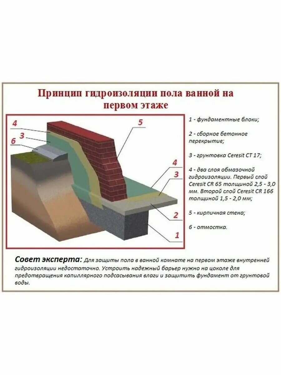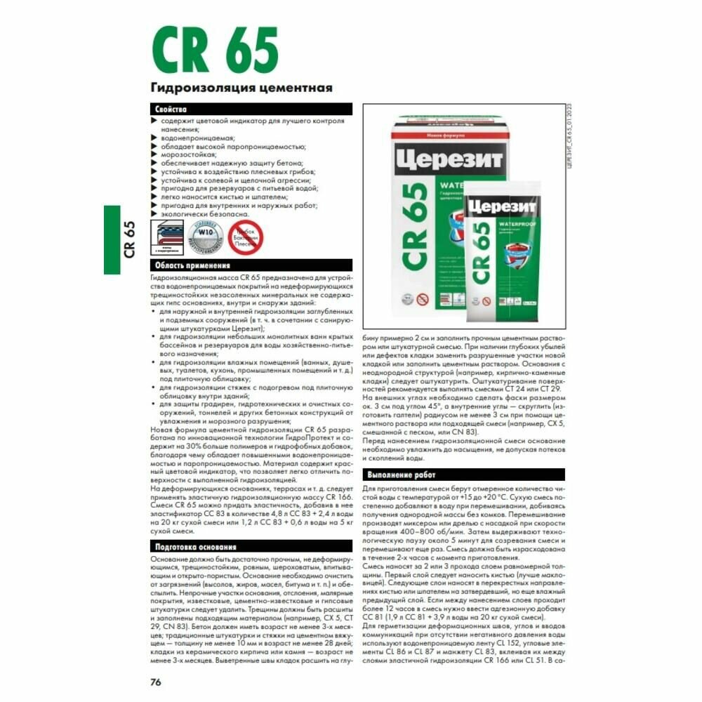 | Дополнительная информация | Может применяться: для наружной и внутренней гидроизоляции заглубленных и подземных сооружений (в т.ч. в сочетании с санирующими штукатурками Ceresit); для гидроизоляции небольших монолитных ванн крытых бассейнов и резервуаров для воды хозяйственно-питьевого назначения; для гидроизоляции влажных помещений (ванных, душевых, туалетов, кухонь, промышленных помещений и т.д.) в т.ч в системе «теплый пол» под плиточную облицовку; для защиты градирен, гидротехнических и очистных сооружений, тоннелей и других бетонных конструкций от увлажнения и морозного разрушения; для заполнения шпуров и пустот при инъектировании кладок старых зданий (см. CO 81). Гидроизоляцию следует защитить от механических повреждений плиточной облицовкой или не содержащими гипс штукатуркой или стяжкой. |