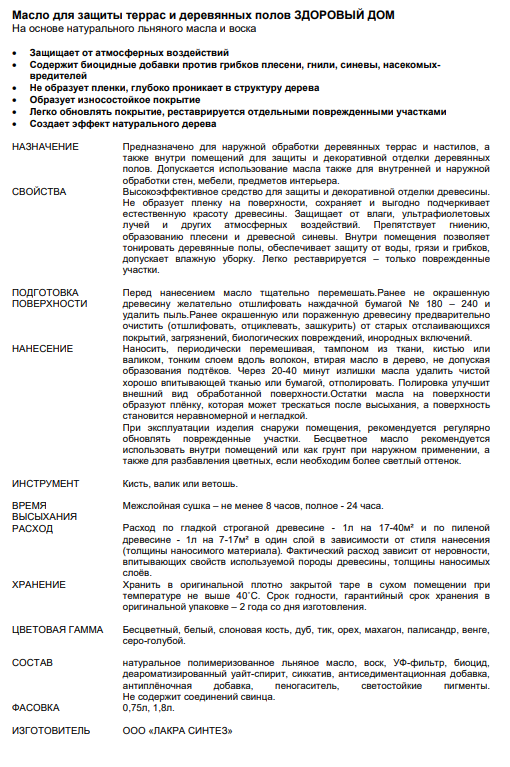 Масло для Защиты Террас и Деревянных Полов Здоровый Дом 0.75л Бесцветный для Внутренних и Наружных Работ.