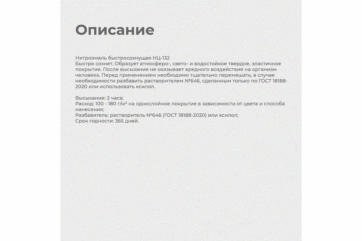 | Дополнительная информация | предназначена для защиты и окраски деревянных, предварительно загрунтованных металлических и других поверхностей; перед применением необходимо тщательно перемешать, в случае необходимости разбавить растворителем №646 |