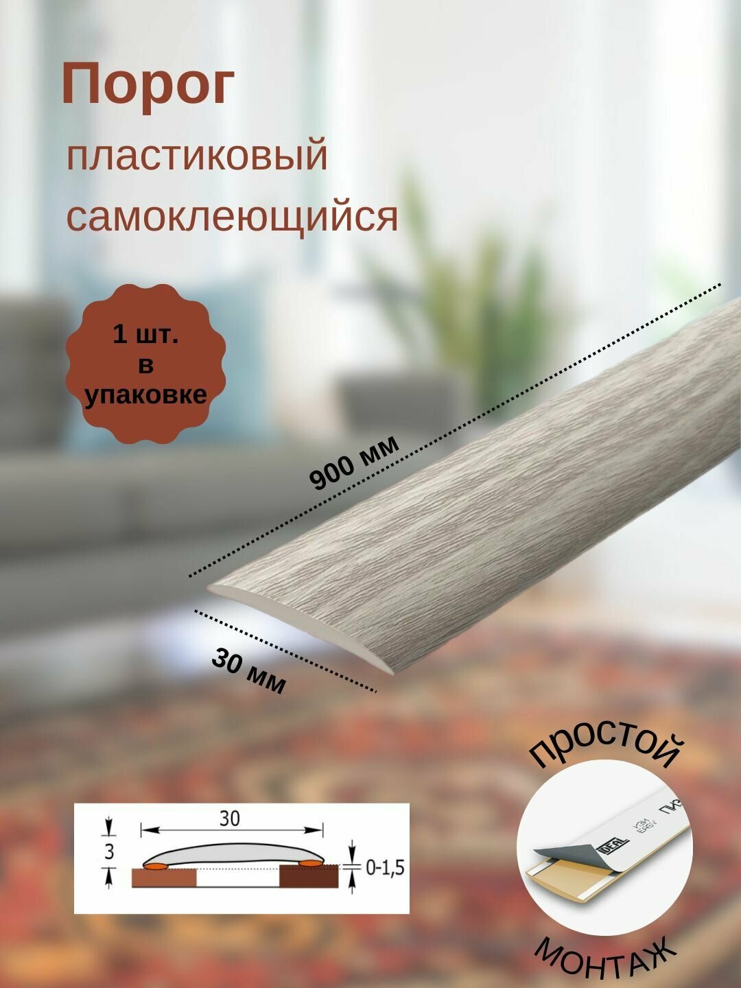 Порог самоклеющийся для пола 30 мм, длина 0,9 м, IDEAL (Идеал) ИЗИ, пластиковый (ПВХ), дуб рустик 211