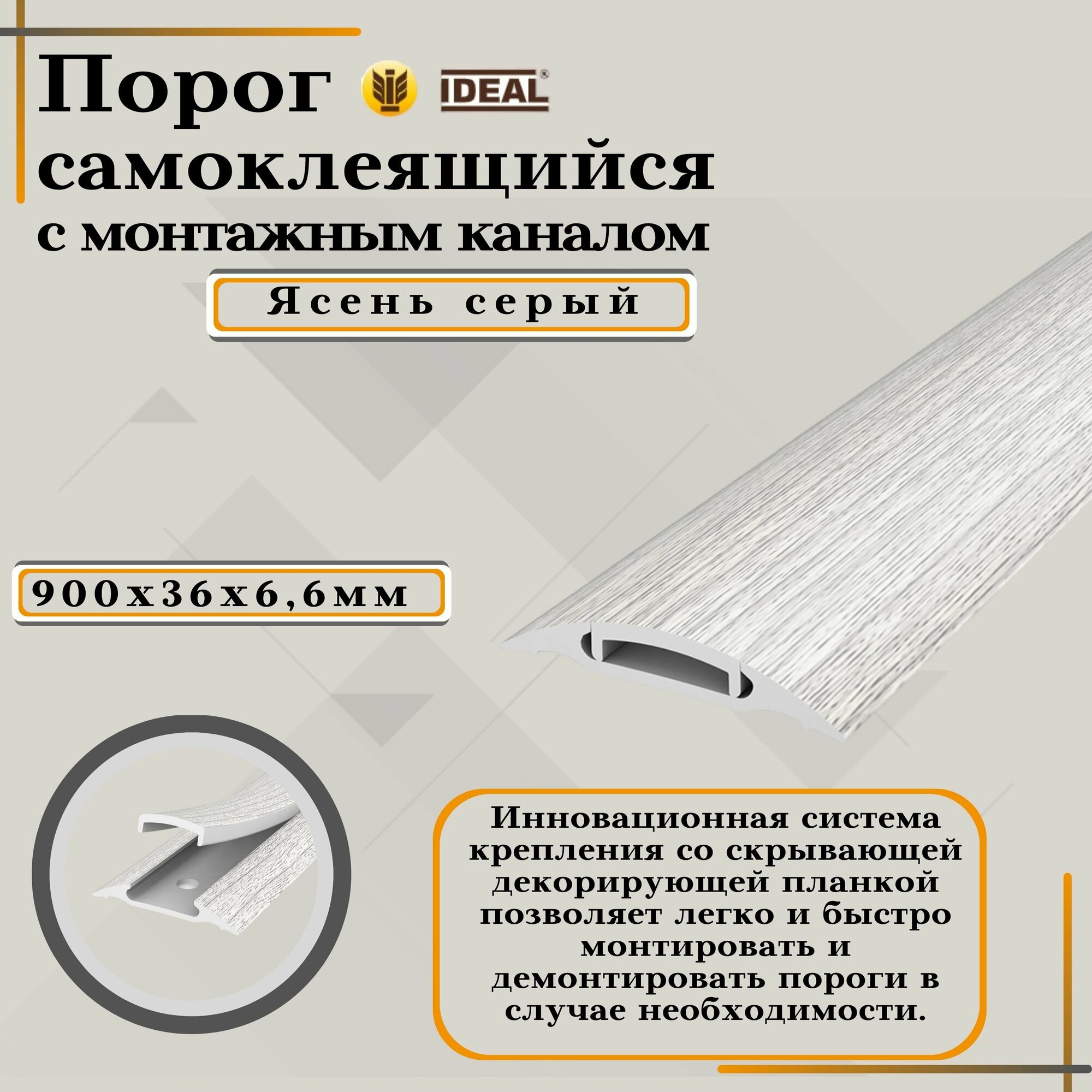 Порог для пола с монтажным каналом идеал (IDEAL) длина 900 мм, ширина 42 мм, 253 Ясень серый
