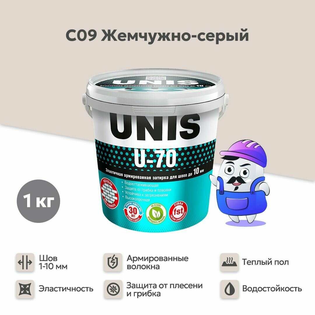 Затирка для плитки эластичная UNIS U-70 2 кг жемчужно-серый С09/ Цементная армированная с защитой от грибка и плесени