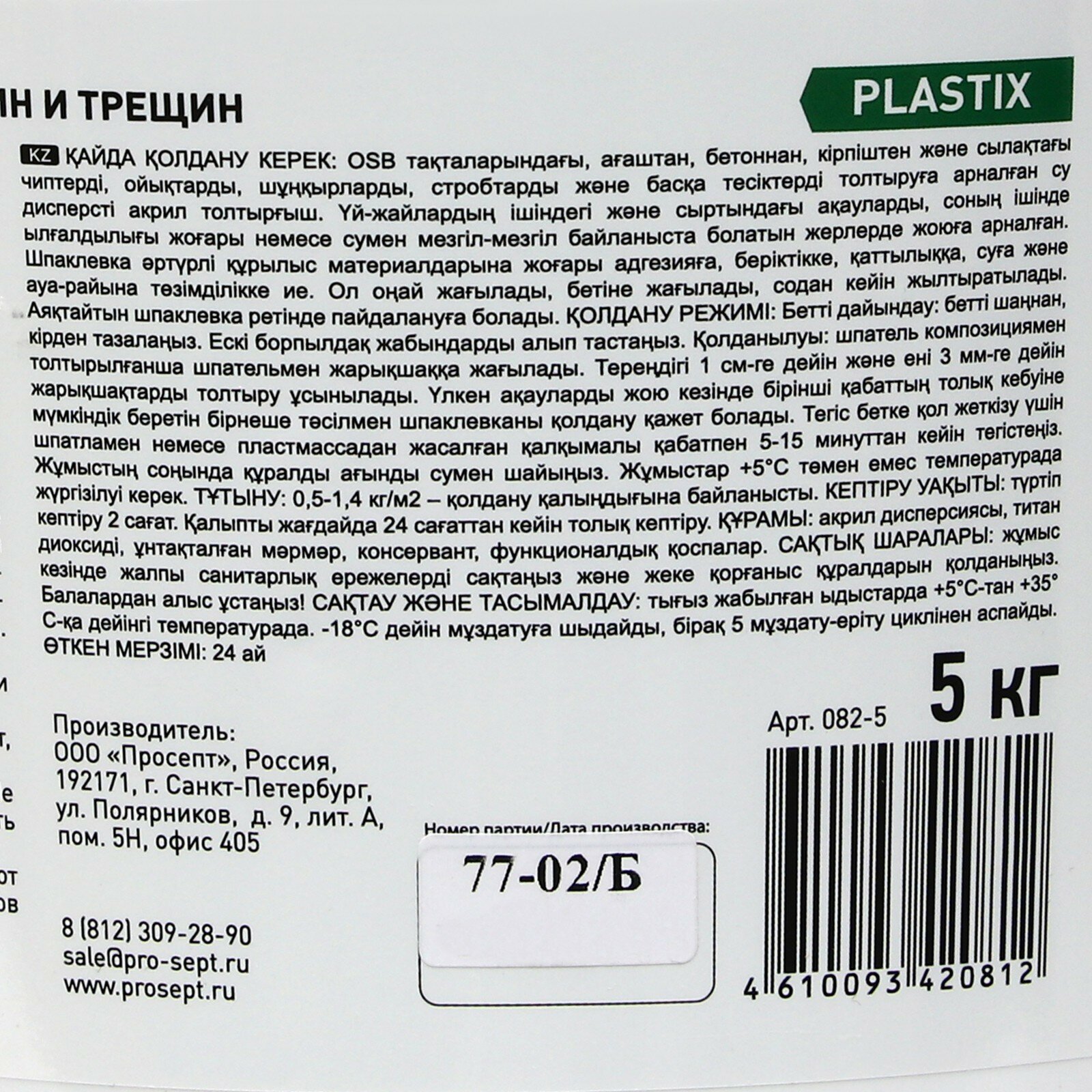Шпатлевка-замазка для заделки Plastix, глубоких выбоин и трещин, 5 кг