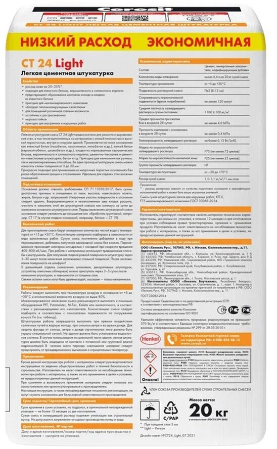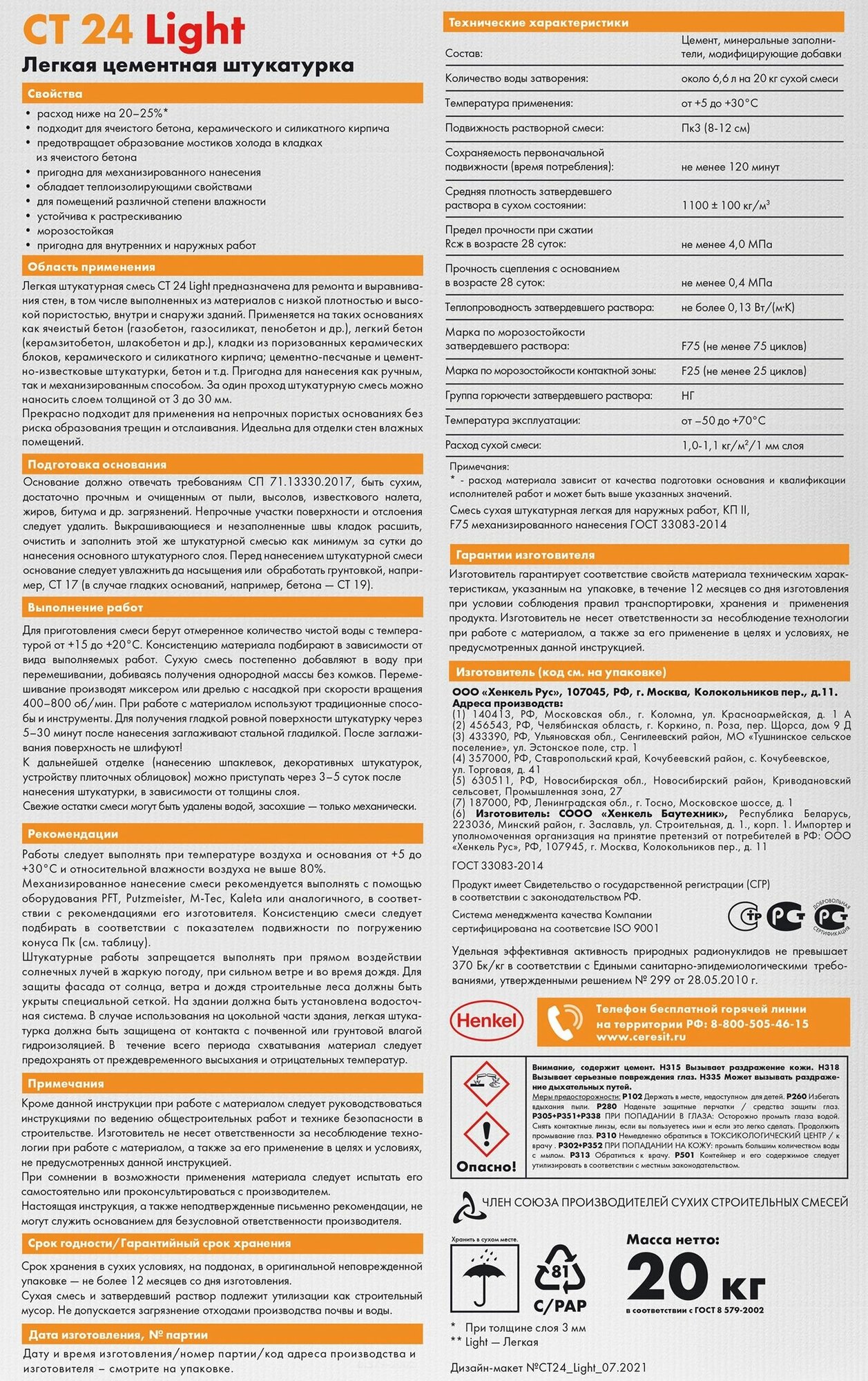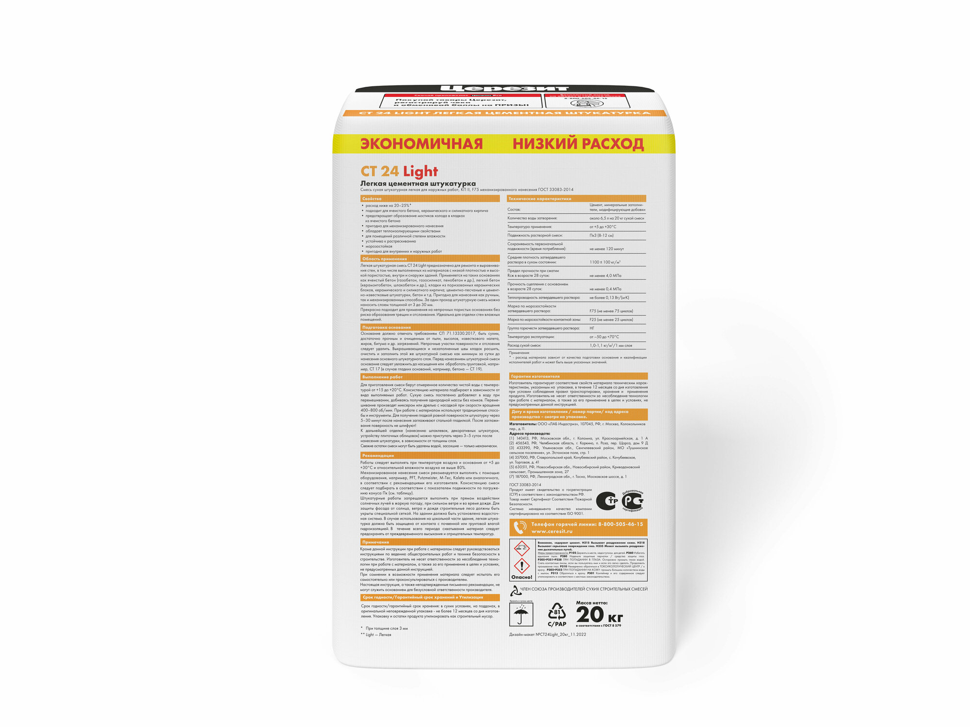 CERESIT CT 24 LIGHT штукатурка для оснований из пено и газобетона, внутри и снаружи помещений (20кг)