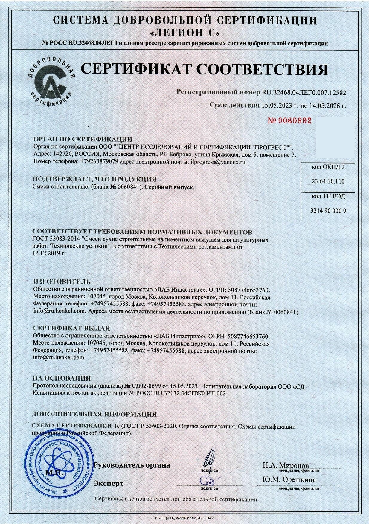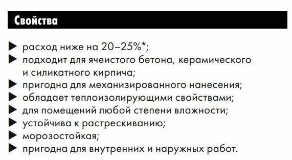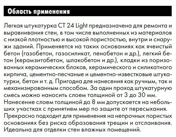 | Дополнительная информация | Применяется на таких основаниях как ячеистый бетон (газобетон, газосиликат, пенобетон и др.), легкий бетон (керамзитобетон, шлакобетон и др.),кладки из поризованных керамических блоков, керамического и силикатного кирпича; цементно-песчаные и цементно-известковые штукатурки, бетон и т.д. Пригодна для нанесения как ручным, так и механизированным способом. За один проход штукатурную смесь можно наносить слоем толщиной от 3 до 30 мм. Прекрасно подходит для применения на непрочных пори стых основаниях без риска образования трещин и отслаивания. Идеальна для отделки стен влажных помещений. |