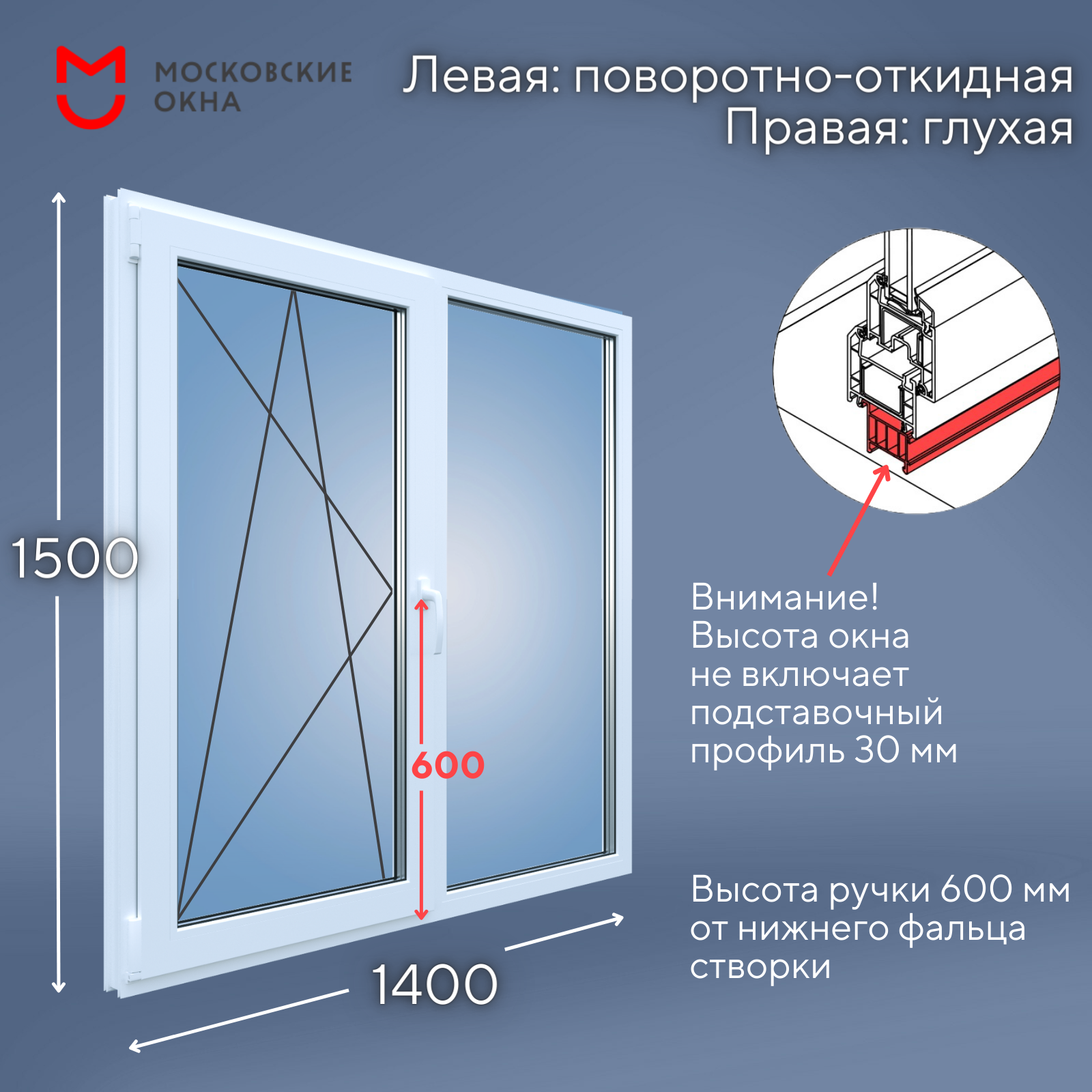 Пластиковое окно 1420х1450 мм (ВхШ) РЕХАУ BLITZ, глухая и поворотно-откидная створки, белое