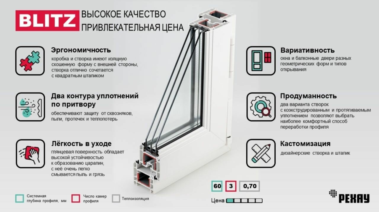 Пластиковое окно ПВХ РЕХАУ BLITZ 800х1100 мм (ВхШ), двухстворчатое, поворотно-откидное левое / глухое правое, двухкамерный стеклопакет, белое