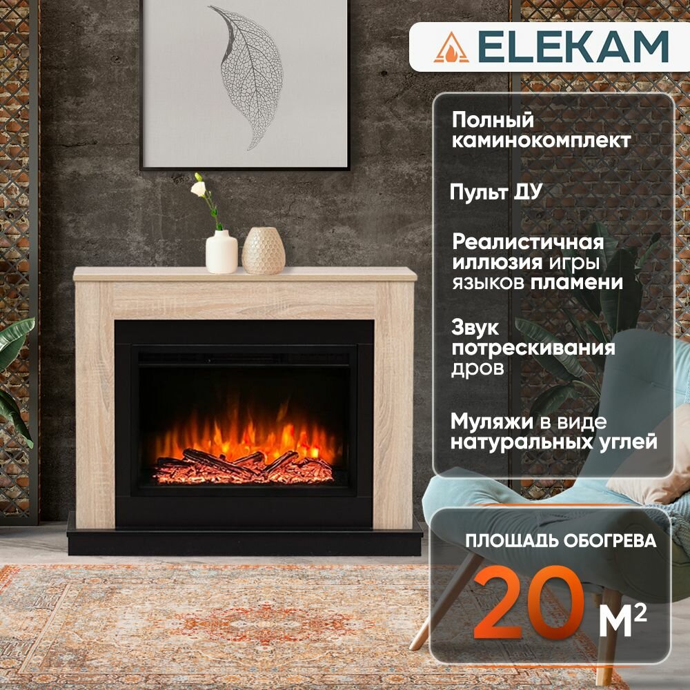 Электрический камин ELEKAM LIGHT standart в цвете дуб сонома+черный с пультом, обогревом и звуком потрескивания дров (Электрокамин)
