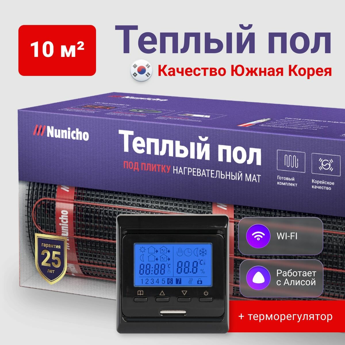 Теплый пол электрический под плитку 1 м2 Nunicho 200 Вт/м2 с Wifi терморегулятором белым, нагревательный мат пр-во Южная Корея