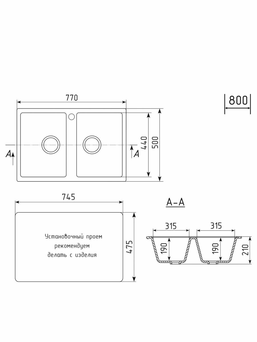 Мойка для кухни врезная прямоугольная, двухчашевая, двойная, из искусственного камня, цвет черный, 770*500*190 мм