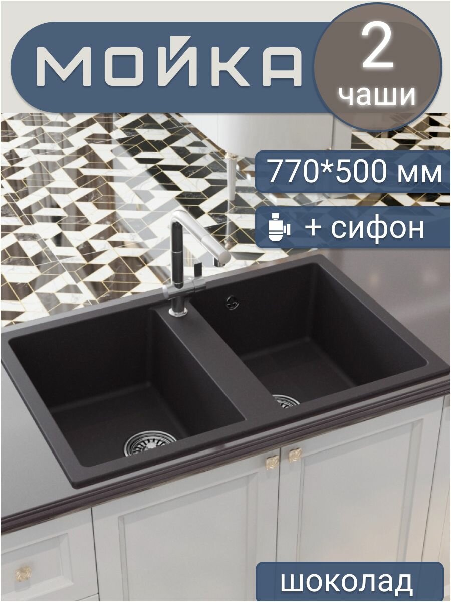 СохранитьМойка для кухни врезная прямоугольная, двухчашевая, двойная, из искусственного камня, цвет шоколад, 770*500*190 мм интересное: