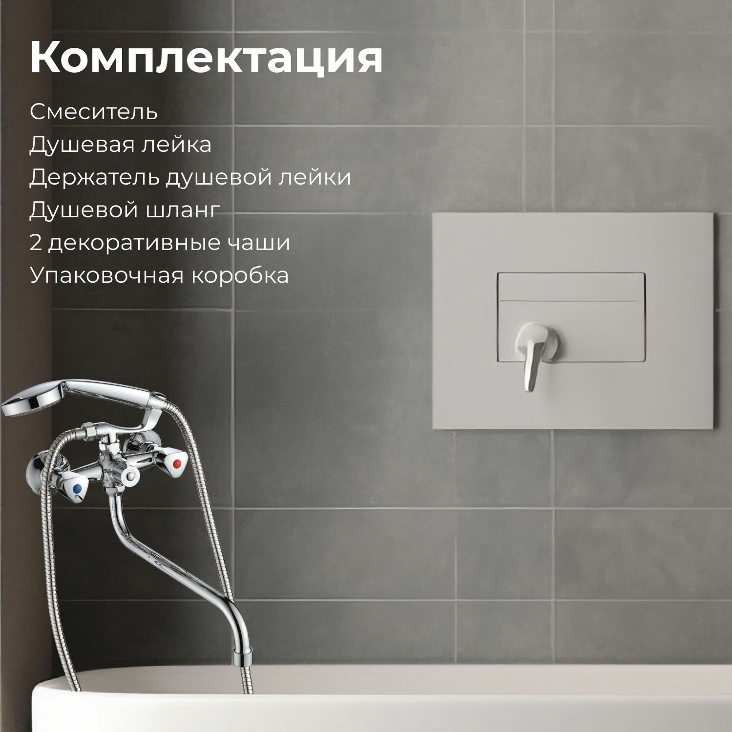 | Комплектация | Душевая лейка; Держатель душевой лейки; Душевой шланг; Смеситель; Декоративная чаша, 2 шт (эксцентриков нет) Гарантийный талон; Упаковочная коробка. |