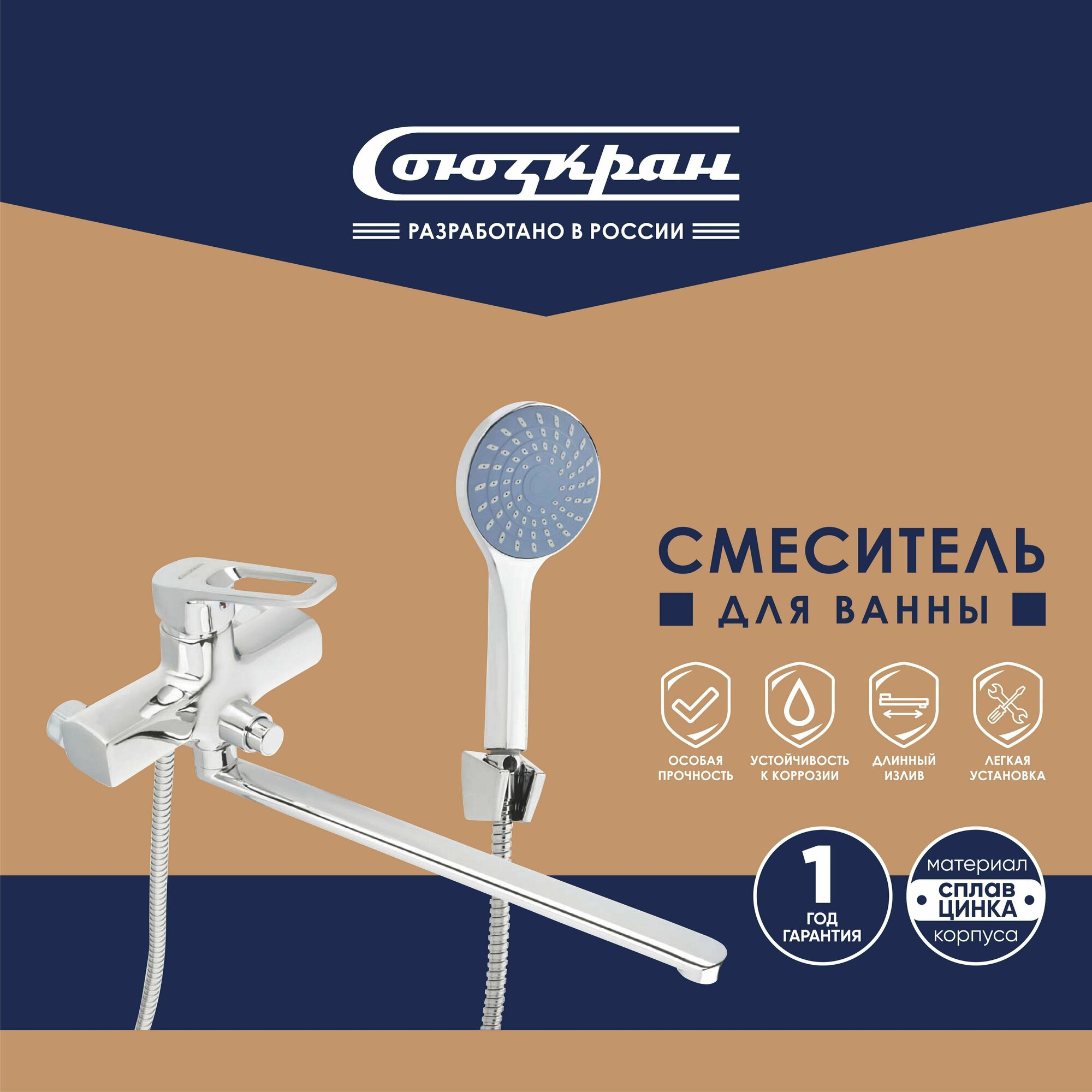 Смеситель для ванны с душем СоюзКран вентильный, прямой излив 35 см, лейка и шланг для душа в комплекте интересное: