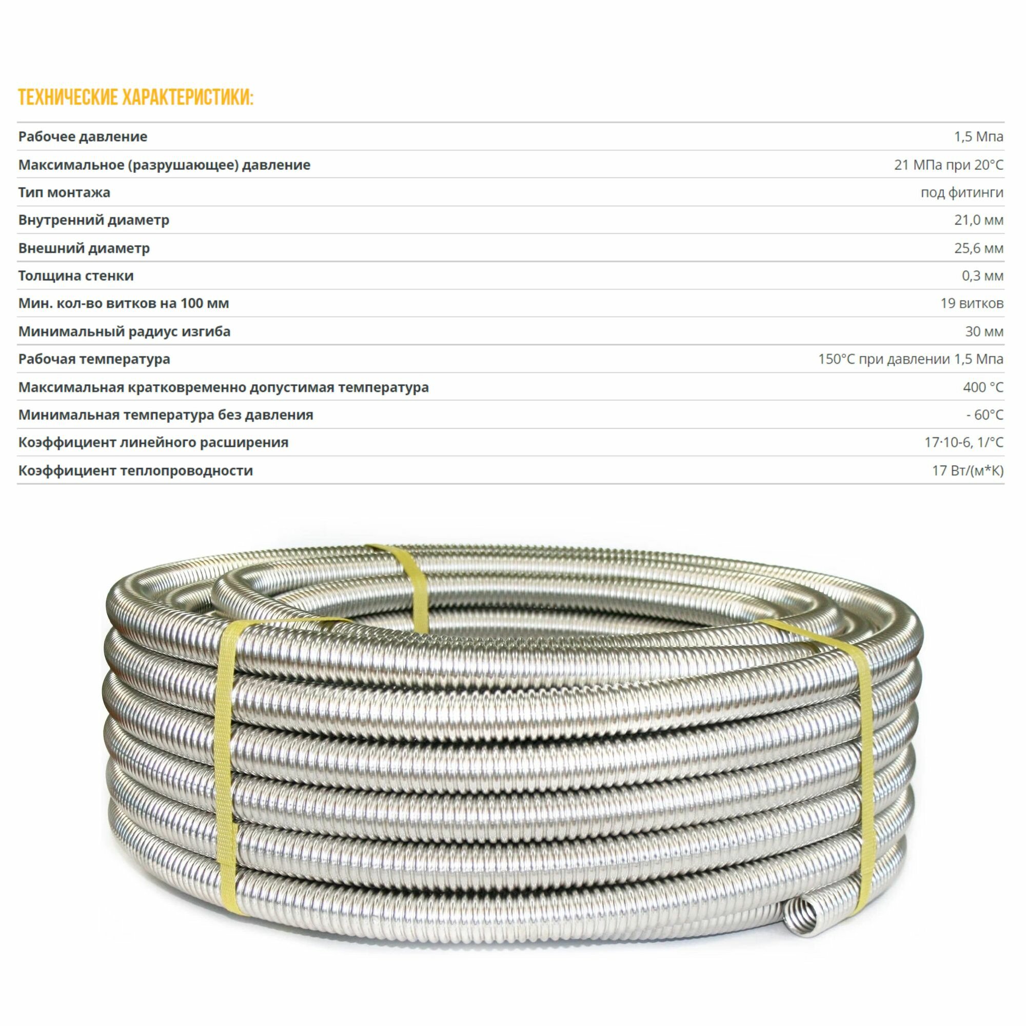 Труба гофрированная из нержавеющей стали SS304 для воды, отопления, теплообменника Stahlmann 20А, отожженная, 25 метров