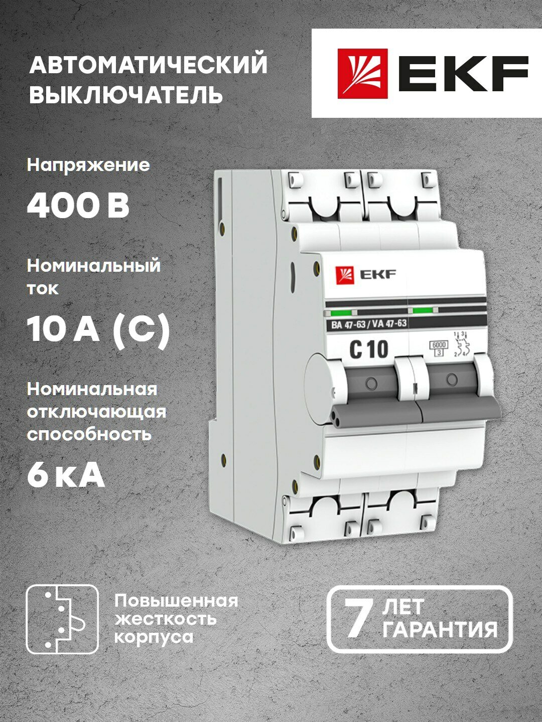 Выключатель автоматический 2p 10А c 6кА ВА 47-63 ekf proxima