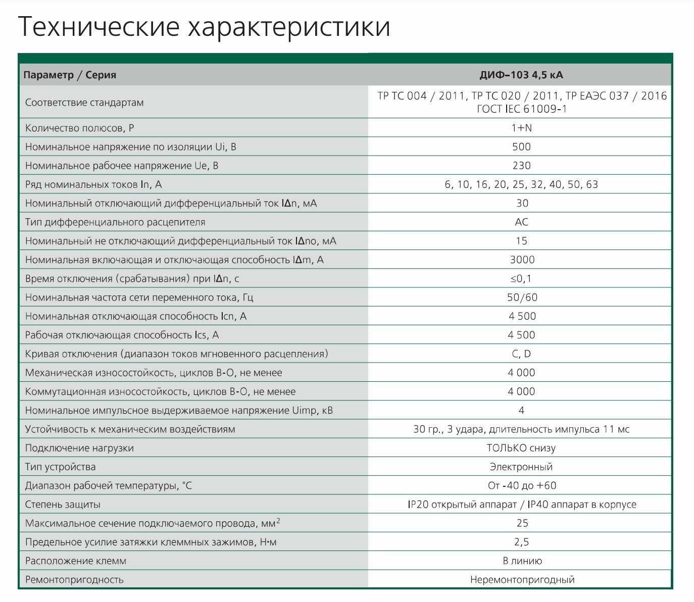 | Дополнительная информация | соответствие стандартам: ТР ТС 004 / 2011, ТР ТС 020 / 2011, ТР ЕАЭС 037 / 2016, ГОСТ IEC 61009-1; номинальный отключающий дифференциальный ток IΔn, мА 30; номинальный не отключающий дифференциальный ток IΔno, мА 15; номинальная включающая и отключающая способность IΔm, А 3000; номинальная частота сети переменного тока, Гц 50/60; номинальная отключающая способность Icn, А 4500; рабочая отключающая способность Ics, А 4500; кривая отключения (диапазон токов мгновенного расцепления) C, D; механическая износостойкость, циклов В-О, не менее 4000; коммутационная износостойкость, циклов В-О, не менее 4000; номинальное напряжение по изоляции Ui, В 500; номинальное импульсное выдерживаемое напряжение Uimp, B 4000; диапазон рабочих температур, °С -40..+60; максимальное сечение подключаемого провода, мм2 25; усилие затяжки клеммных зажимов, Н·м 2,0; неремонтопригодный |