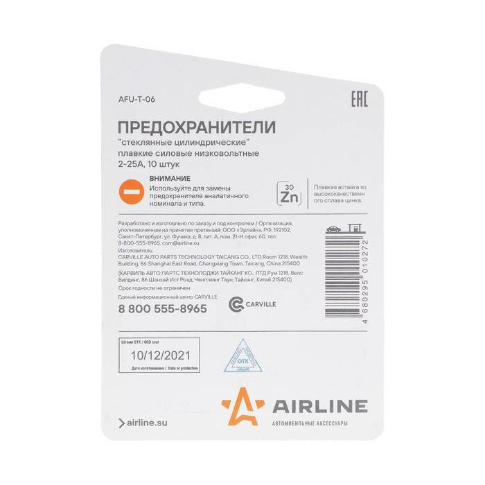 Предохранители "стеклянные цилиндрические" в блистере (10 шт. 2-25А) (AFU-T-06) AIRLINE интересное: