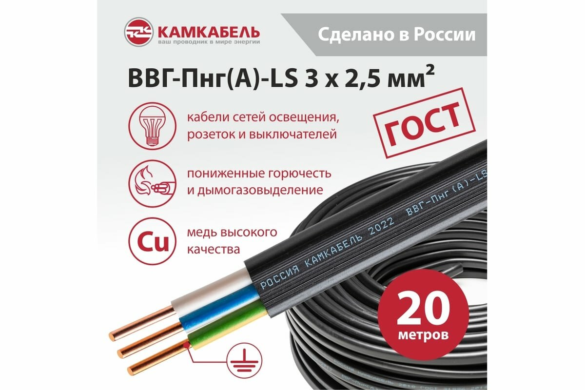 Кабель ВВГ-ПНГ А - LS Камкабель 3x2.5 мм 20 м ГОСТ 1157К30HG00070А0020М