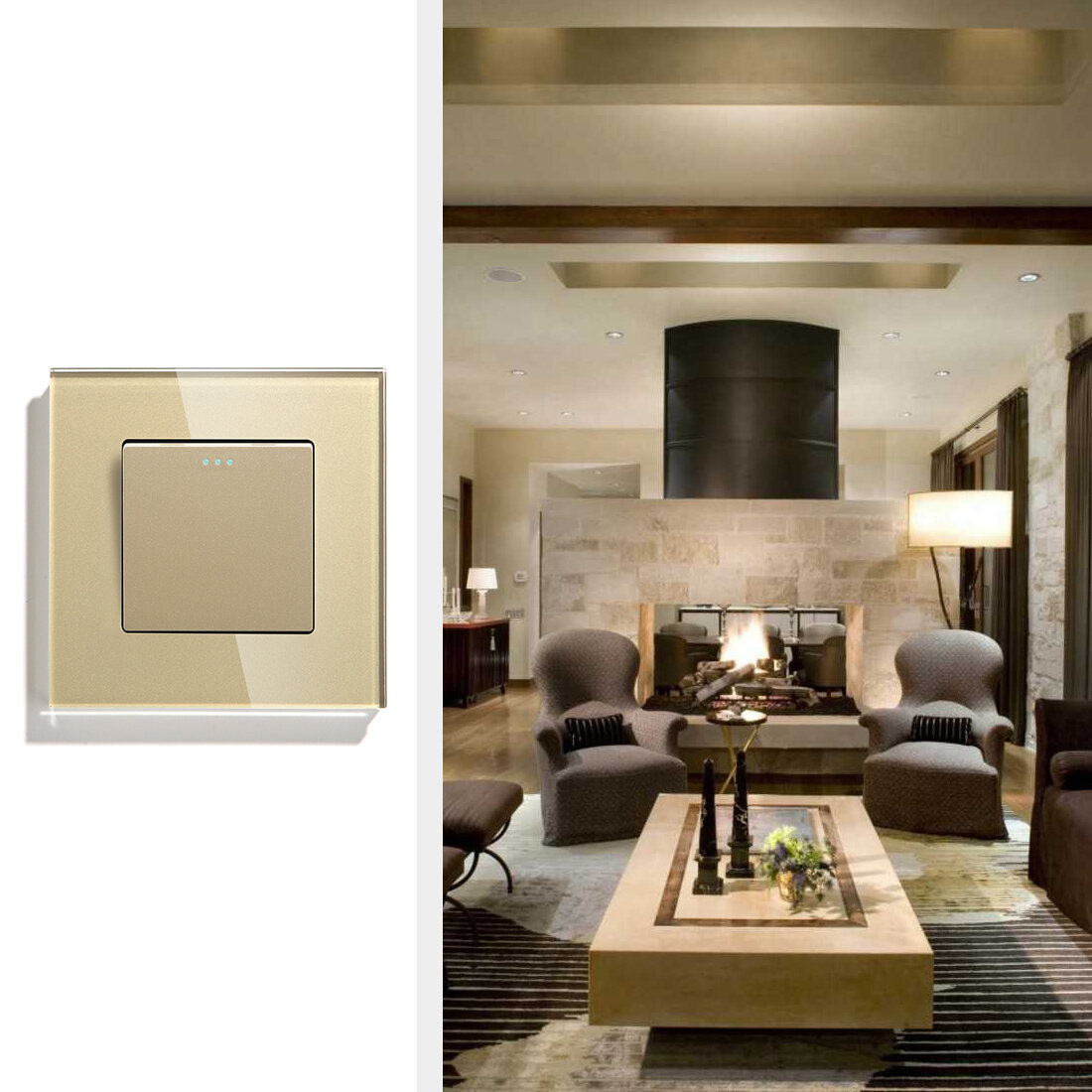 Купить Выключатель механический, 1 клавиша, 1 пост, рамка стекло 86х86мм цвет золотой