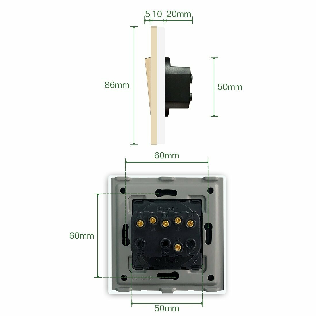Выключатель механический, 2 клавиши, 1 пост, рамка стекло 86х86мм цвет золотой