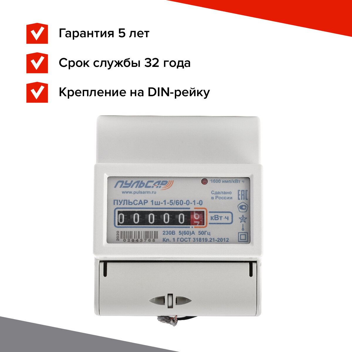 Однофазный однотарифный механический счетчик электроэнергии Пульсар 1ш-1-5/60-0-1-0 МПИ 16лет Н00013 .