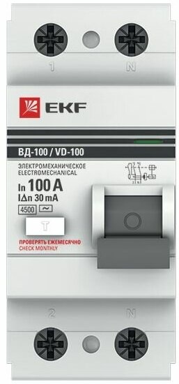 Устройство защитного отключения УЗО ВД-100 2 полюса, 63А, Тип AC, 30мА | код. elcb-2-63-30-em-pro | EKF ( 1шт. )