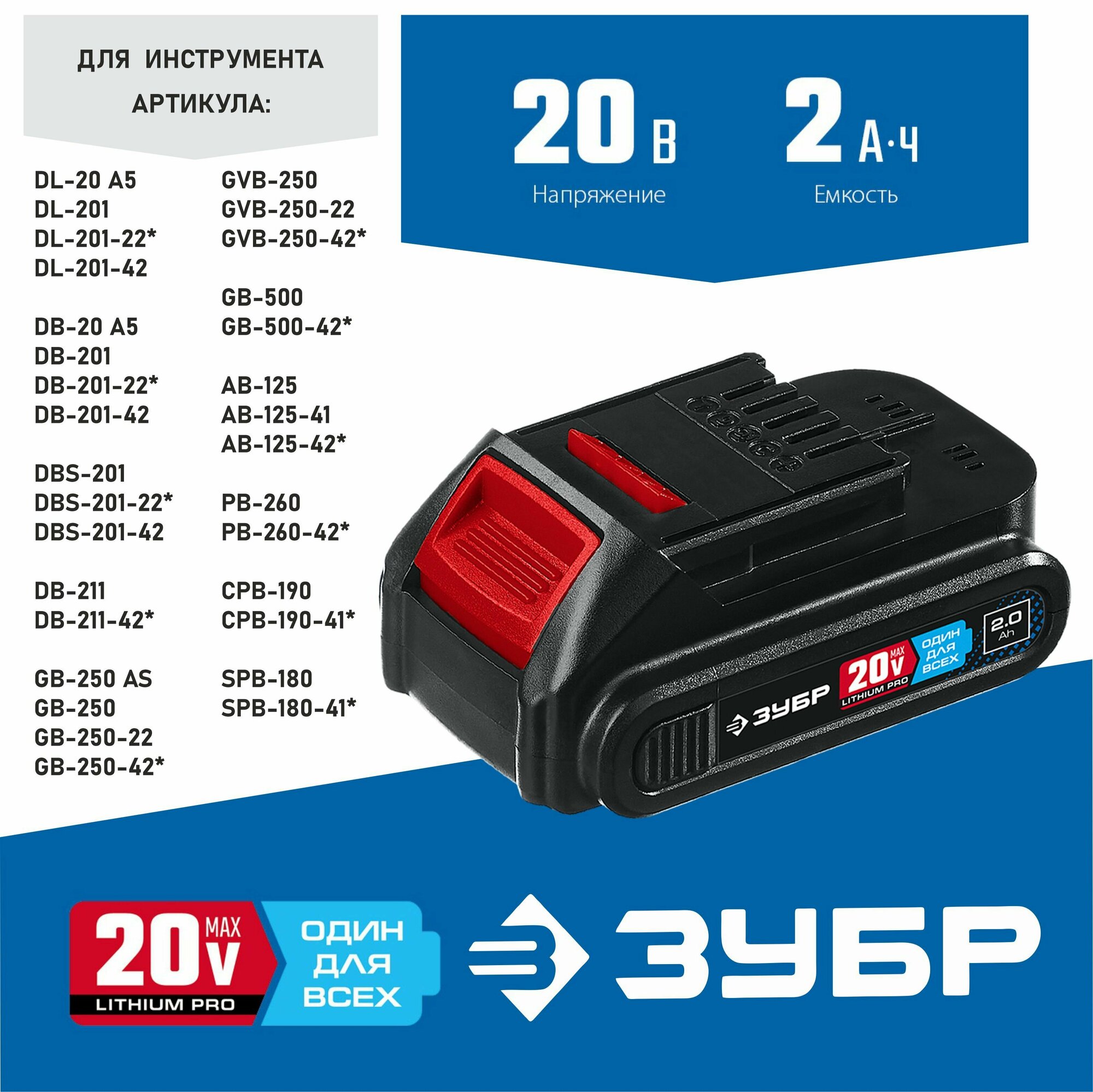ЗУБР T7, 20 В, 2.0 А·ч, аккумуляторная батарея, Профессионал (ST7-20-2)