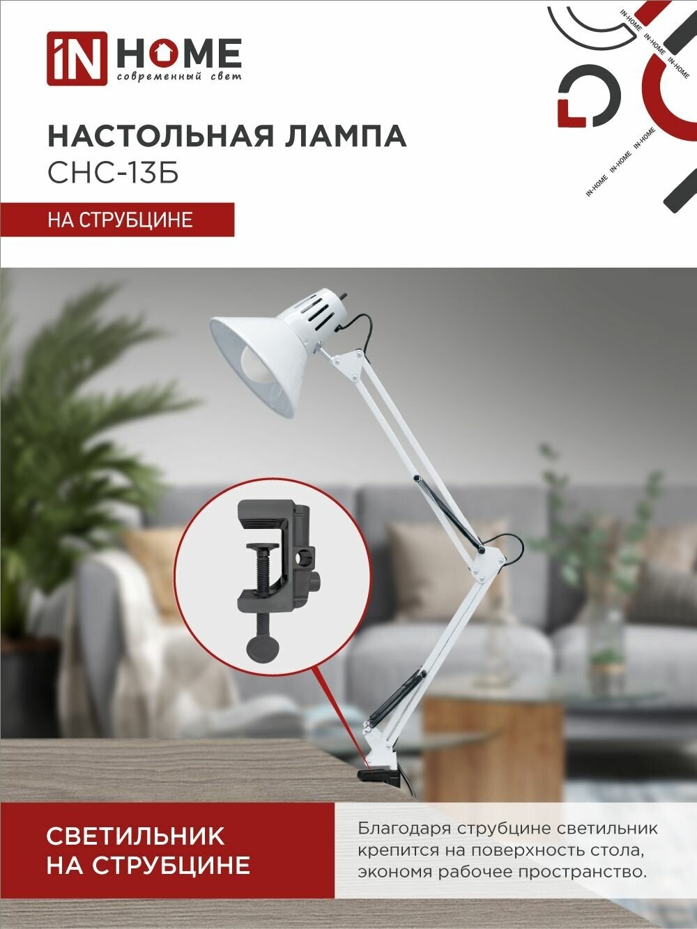 IN Home Светильник наст. п/лампу Снс-13б на струбцине 60Вт E27 Белый коробка 4690612012728