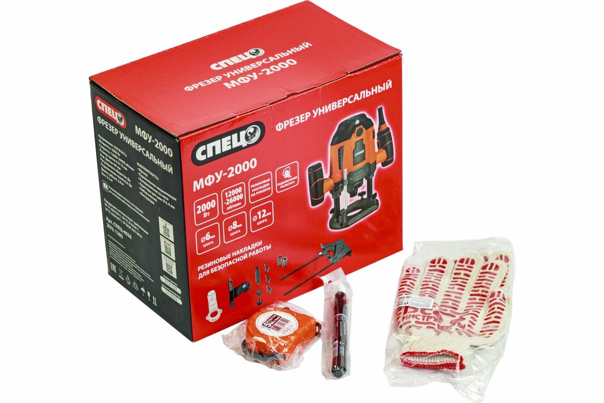Спец Фрезер универсальный МФУ-2000 (нов дизайн),2000Вт,12000-26000об/мин,6-8-12мм+Маркер +Перчатки трикотажные+Рулетка 5мх18мм СПЕЦ-4038/3385/8058/360 интересное: