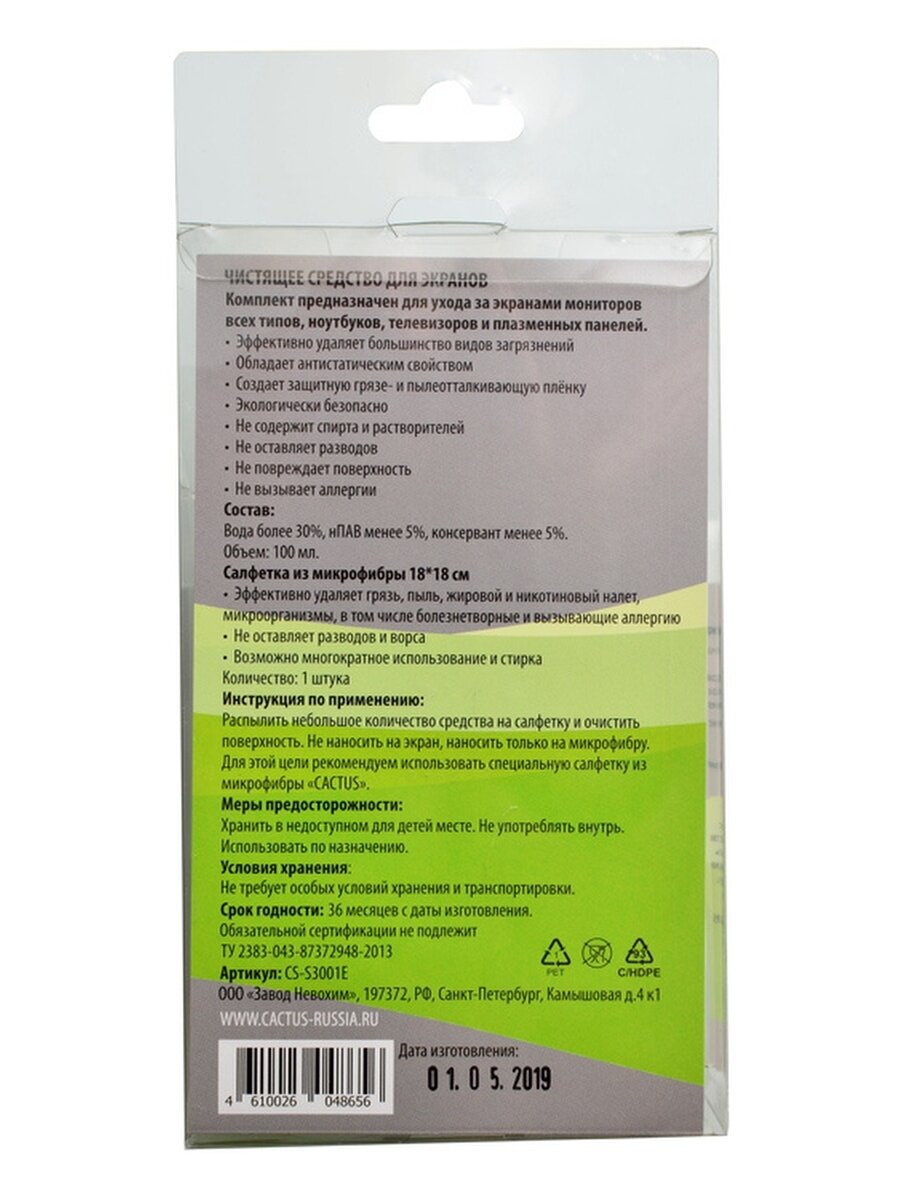 Чистящие набор Cactus CS-S3001E спрей 100 мл + микрофибра (18х18см, 1 шт.) для чистки экрана