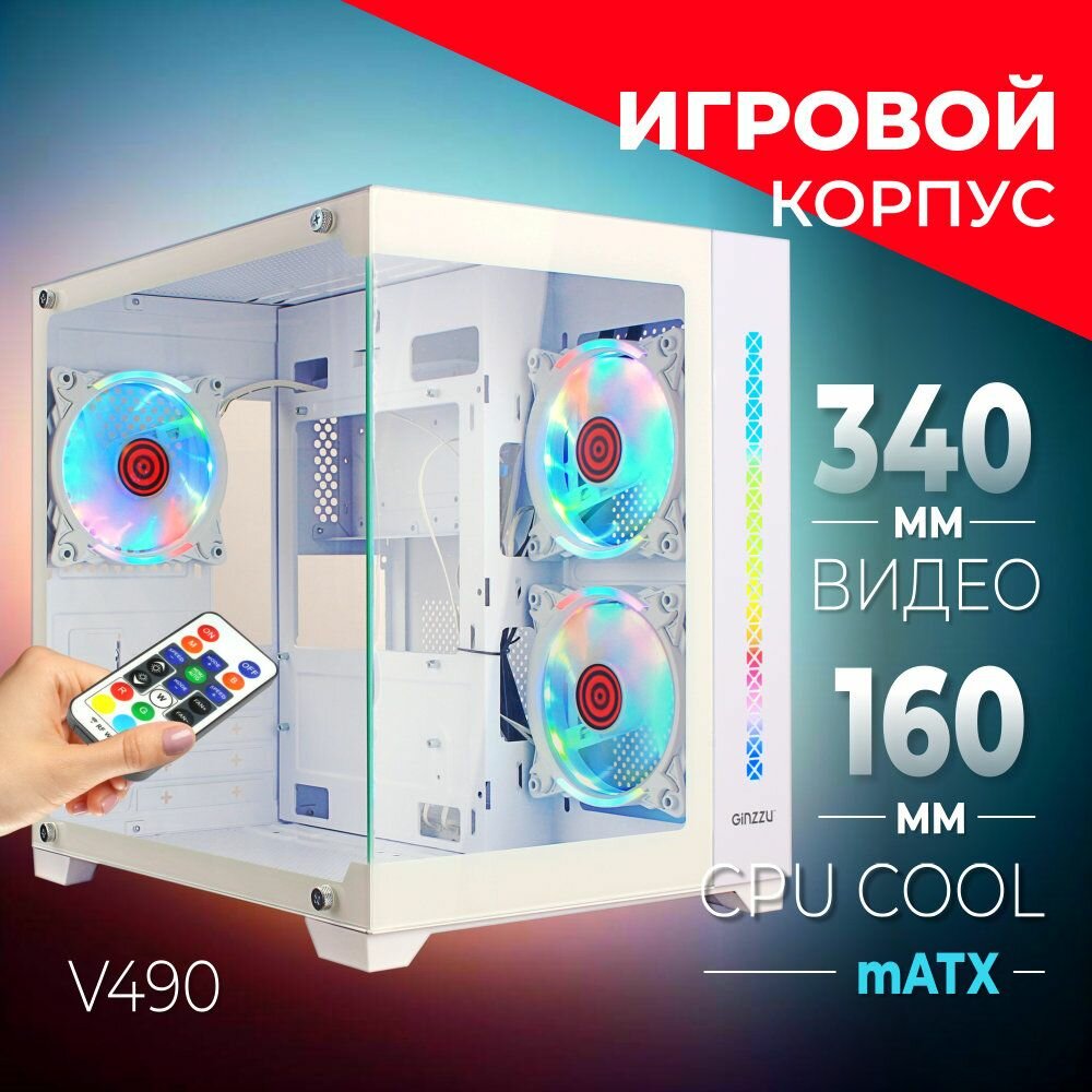 Корпус Ginzzu V490 mATX кубик, закаленное стекло, RGB подсветка, система охлаждения