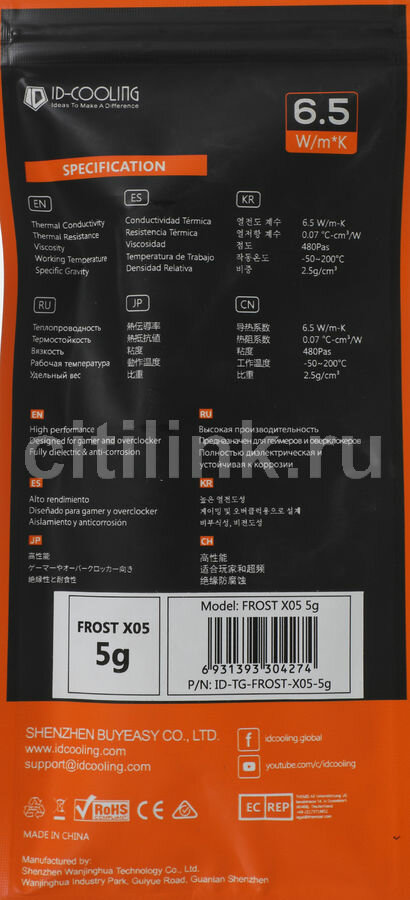 | Дополнительная информация | Термопаста ID-COOLING FROST X05, 6.5 Вт/м·К, шприц, 5 г, серый (FROST X05 5g) |