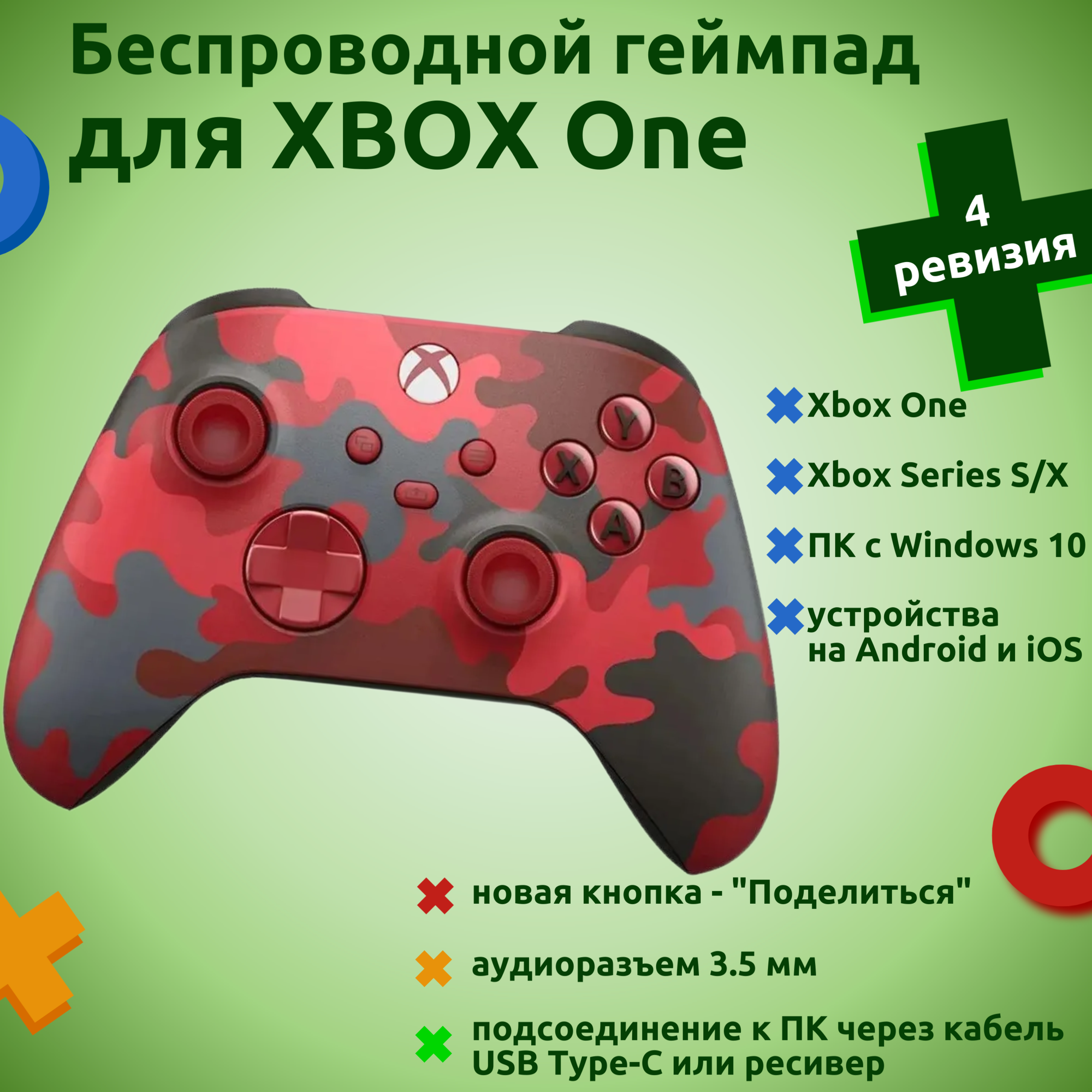 Геймпад беспроводной для Xbox One, Series X/S, с Bluetooth, красный/черный камуфляж (модель 1914, 4 ревизия) интересное: